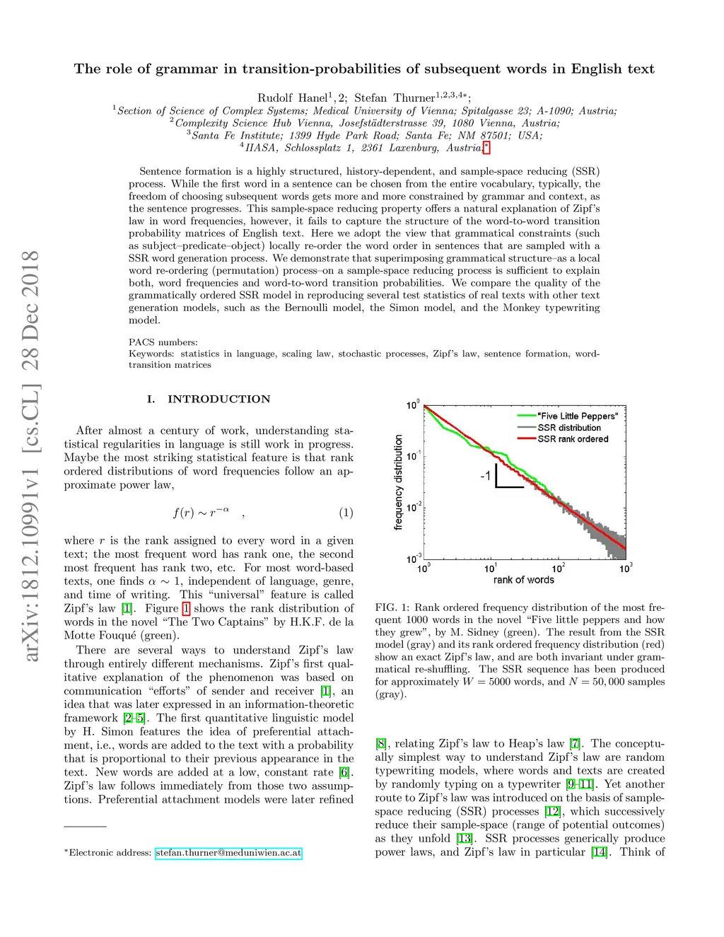 Sentence formation is a highly structured, history-dependent, and sample-space reducing (SSR) process. While the first word in a sentence can be chosen from the entire vocabulary, typically, the freedom of choosing subsequent words gets more and more constrained by grammar and context, as the sentence progresses. This sample-space reducing property offers a natural explanation of Zipf's law in word frequencies, however, it fails to capture the structure of the word-to-word transition probability matrices of English text. Here we adopt the view that grammatical constraints (such as subject--predicate--object) locally re-order the word order in sentences that are sampled with a SSR word generation process. We demonstrate that superimposing grammatical structure -- as a local word re-ordering (permutation) process -- on a sample-space reducing process is sufficient to explain both, word frequencies and word-to-word transition probabilities. We compare the quality of the grammatically ordered SSR model in reproducing several test statistics of real texts with other text generation models, such as the Bernoulli model, the Simon model, and the Monkey typewriting model.