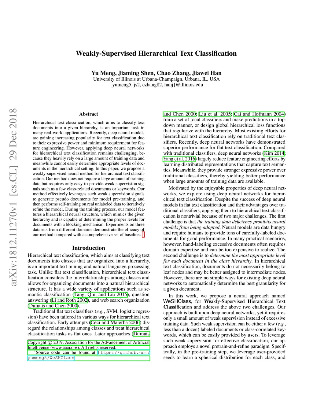 Hierarchical text classification, which aims to classify text documents into a given hierarchy, is an important task in many real-world applications. Recently, deep neural models are gaining increasing popularity for text classification due to their expressive power and minimum requirement for feature engineering. However, applying deep neural networks for hierarchical text classification remains challenging, because they heavily rely on a large amount of training data and meanwhile cannot easily determine appropriate levels of documents in the hierarchical setting. In this paper, we propose a weakly-supervised neural method for hierarchical text classification. Our method does not require a large amount of training data but requires only easy-to-provide weak supervision signals such as a few class-related documents or keywords. Our method effectively leverages such weak supervision signals to generate pseudo documents for model pre-training, and then performs self-training on real unlabeled data to iteratively refine the model. During the training process, our model features a hierarchical neural structure, which mimics the given hierarchy and is capable of determining the proper levels for documents with a blocking mechanism. Experiments on three datasets from different domains demonstrate the efficacy of our method compared with a comprehensive set of baselines.