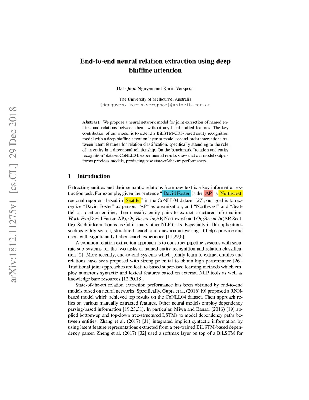 End-to-end neural relation extraction using deep biaffine attention