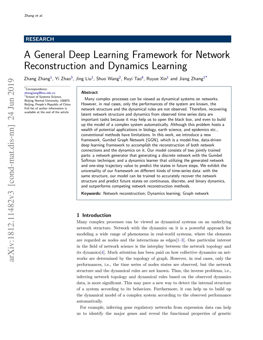 Many complex processes can be viewed as dynamical systems on networks. However, in real cases, only the performances of the system are known, the network structure and the dynamical rules are not observed. Therefore, recovering latent network structure and dynamics from observed time series data are important tasks because it may help us to open the black box, and even to build up the model of a complex system automatically. Although this problem hosts a wealth of potential applications in biology, earth science, and epidemics etc., conventional methods have limitations. In this work, we introduce a new framework, Gumbel Graph Network (GGN), which is a model-free, data-driven deep learning framework to accomplish the reconstruction of both network connections and the dynamics on it. Our model consists of two jointly trained parts: a network generator that generating a discrete network with the Gumbel Softmax technique; and a dynamics learner that utilizing the generated network and one-step trajectory value to predict the states in future steps. We exhibit the universality of our framework on different kinds of time-series data: with the same structure, our model can be trained to accurately recover the network structure and predict future states on continuous, discrete, and binary dynamics, and outperforms competing network reconstruction methods.