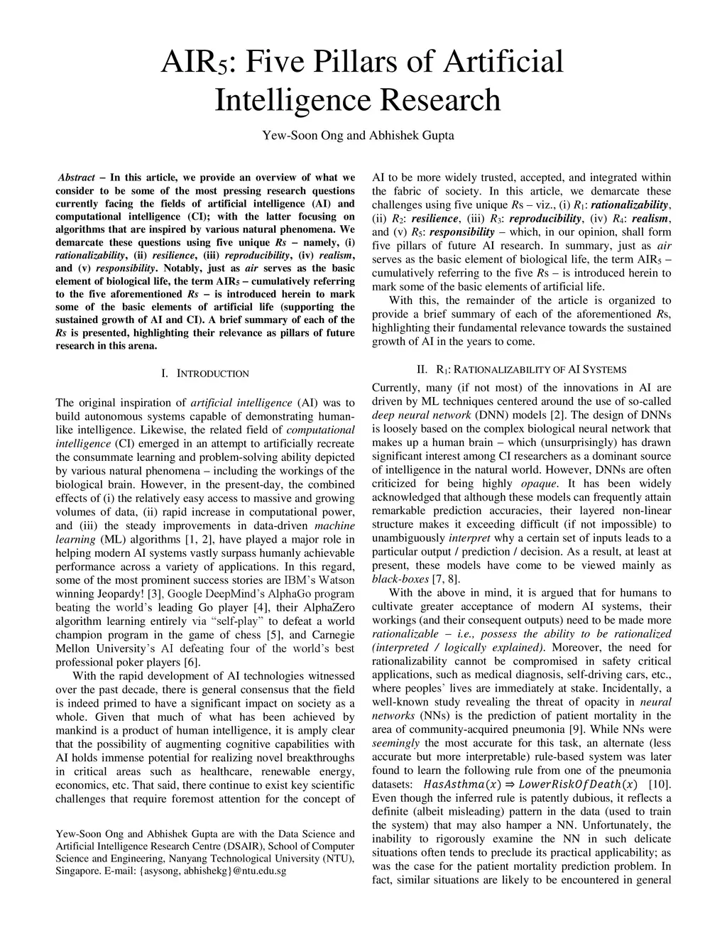 In this article, we provide and overview of what we consider to be some of the most pressing research questions facing the fields of artificial intelligence (AI) and computational intelligence (CI); with the latter focusing on algorithms that are inspired by various natural phenomena. We demarcate these questions using five unique Rs - namely, (i) rationalizability, (ii) resilience, (iii) reproducibility, (iv) realism, and (v) responsibility. Notably, just as air serves as the basic element of biological life, the term AIR5 - cumulatively referring to the five aforementioned Rs - is introduced herein to mark some of the basic elements of artificial life (supporting the sustained growth of AI and CI). A brief summary of each of the Rs is presented, highlighting their relevance as pillars of future research in this arena.