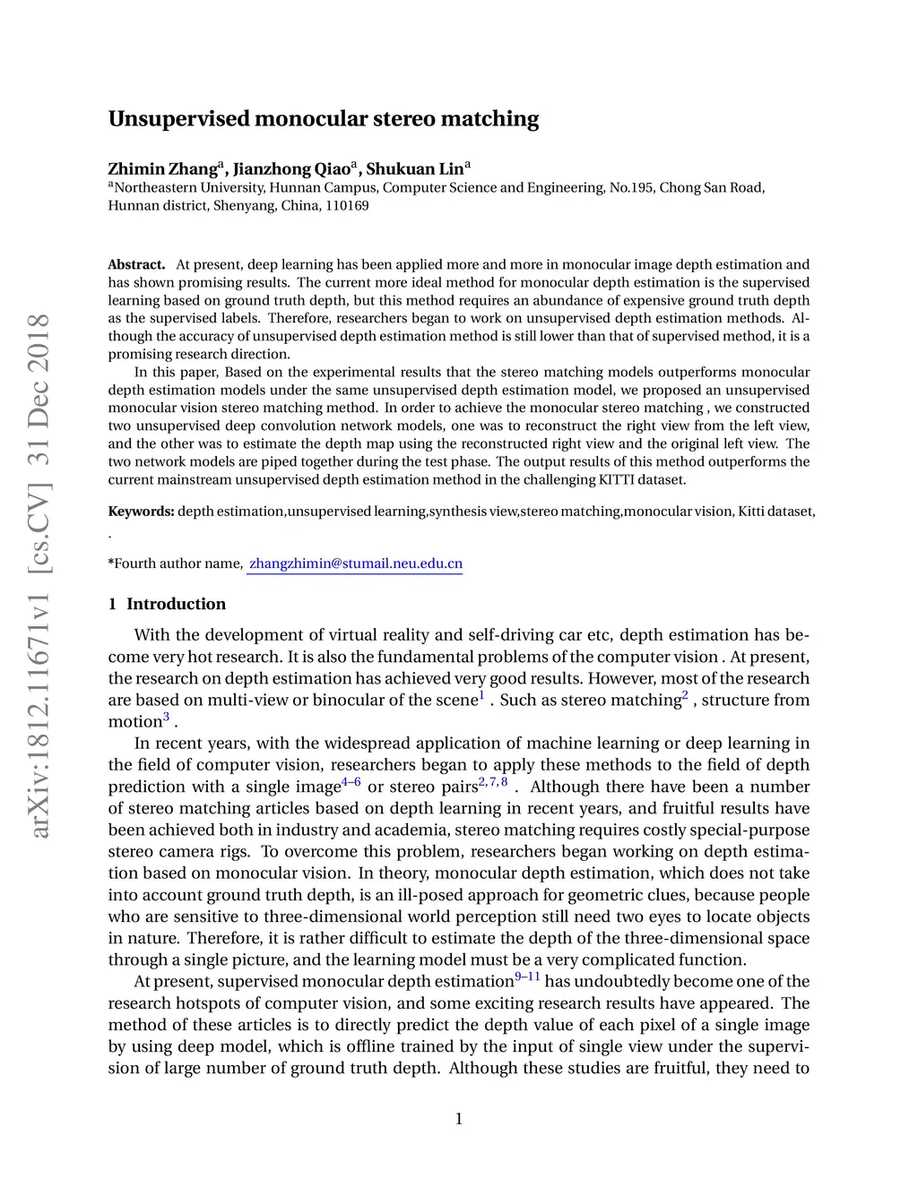 At present, deep learning has been applied more and more in monocular image depth estimation and has shown promising results. The current more ideal method for monocular depth estimation is the supervised learning based on ground truth depth, but this method requires an abundance of expensive ground truth depth as the supervised labels. Therefore, researchers began to work on unsupervised depth estimation methods. Although the accuracy of unsupervised depth estimation method is still lower than that of supervised method, it is a promising research direction. In this paper, Based on the experimental results that the stereo matching models outperforms monocular depth estimation models under the same unsupervised depth estimation model, we proposed an unsupervised monocular vision stereo matching method. In order to achieve the monocular stereo matching, we constructed two unsupervised deep convolution network models, one was to reconstruct the right view from the left view, and the other was to estimate the depth map using the reconstructed right view and the original left view. The two network models are piped together during the test phase. The output results of this method outperforms the current mainstream unsupervised depth estimation method in the challenging KITTI dataset.