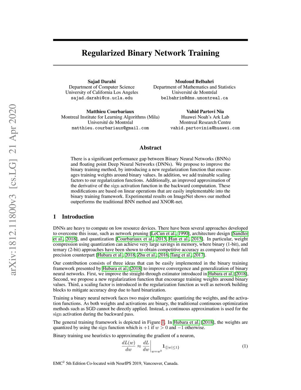 There is a significant performance gap between Binary Neural Networks (BNNs) and floating point Deep Neural Networks (DNNs). We propose to improve the binary training method, by introducing a new regularization function that encourages training weights around binary values. In addition, we add trainable scaling factors to our regularization functions. Additionally, an improved approximation of the derivative of the sign activation function in the backward computation. These modifications are based on linear operations that are easily implementable into the binary training framework. Experimental results on ImageNet shows our method outperforms the traditional BNN method and XNOR-net.