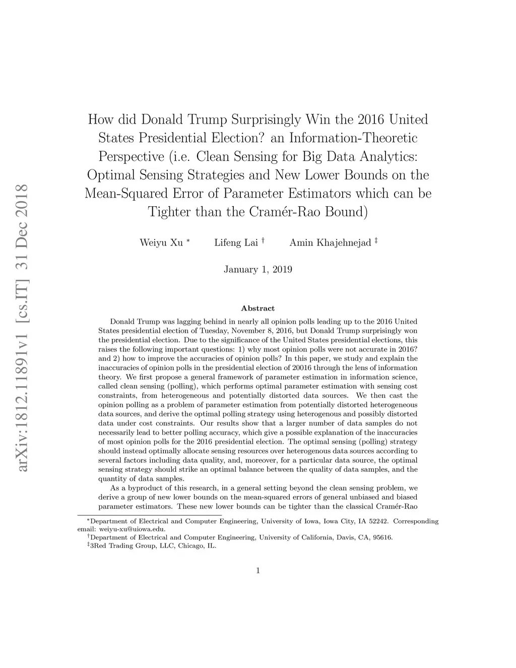 Donald Trump was lagging behind in nearly all opinion polls leading up to the 2016 US presidential election, but he surprisingly won the election. This raises the following important questions: 1) why most opinion polls were not accurate in 2016? and 2) how to improve the accuracies of opinion polls? In this paper, we study the inaccuracies of opinion polls in the 2016 election through the lens of information theory. We first propose a general framework of parameter estimation, called clean sensing (polling), which performs optimal parameter estimation with sensing cost constraints, from heterogeneous and potentially distorted data sources. We then cast the opinion polling as a problem of parameter estimation from potentially distorted heterogeneous data sources, and derive the optimal polling strategy using heterogenous and possibly distorted data under cost constraints. Our results show that a larger number of data samples do not necessarily lead to better polling accuracy, which give a possible explanation of the inaccuracies of opinion polls in 2016. The optimal sensing strategy should instead optimally allocate sensing resources over heterogenous data sources according to several factors including data quality, and, moreover, for a particular data source, it should strike an optimal balance between the quality of data samples, and the quantity of data samples. As a byproduct of this research, in a general setting, we derive a group of new lower bounds on the mean-squared errors of general unbiased and biased parameter estimators. These new lower bounds can be tighter than the classical Cram\'{e}r-Rao bound (CRB) and Chapman-Robbins bound. Our derivations are via studying the Lagrange dual problems of certain convex programs. The classical Cram\'{e}r-Rao bound and Chapman-Robbins bound follow naturally from our results for special cases of these convex programs.
