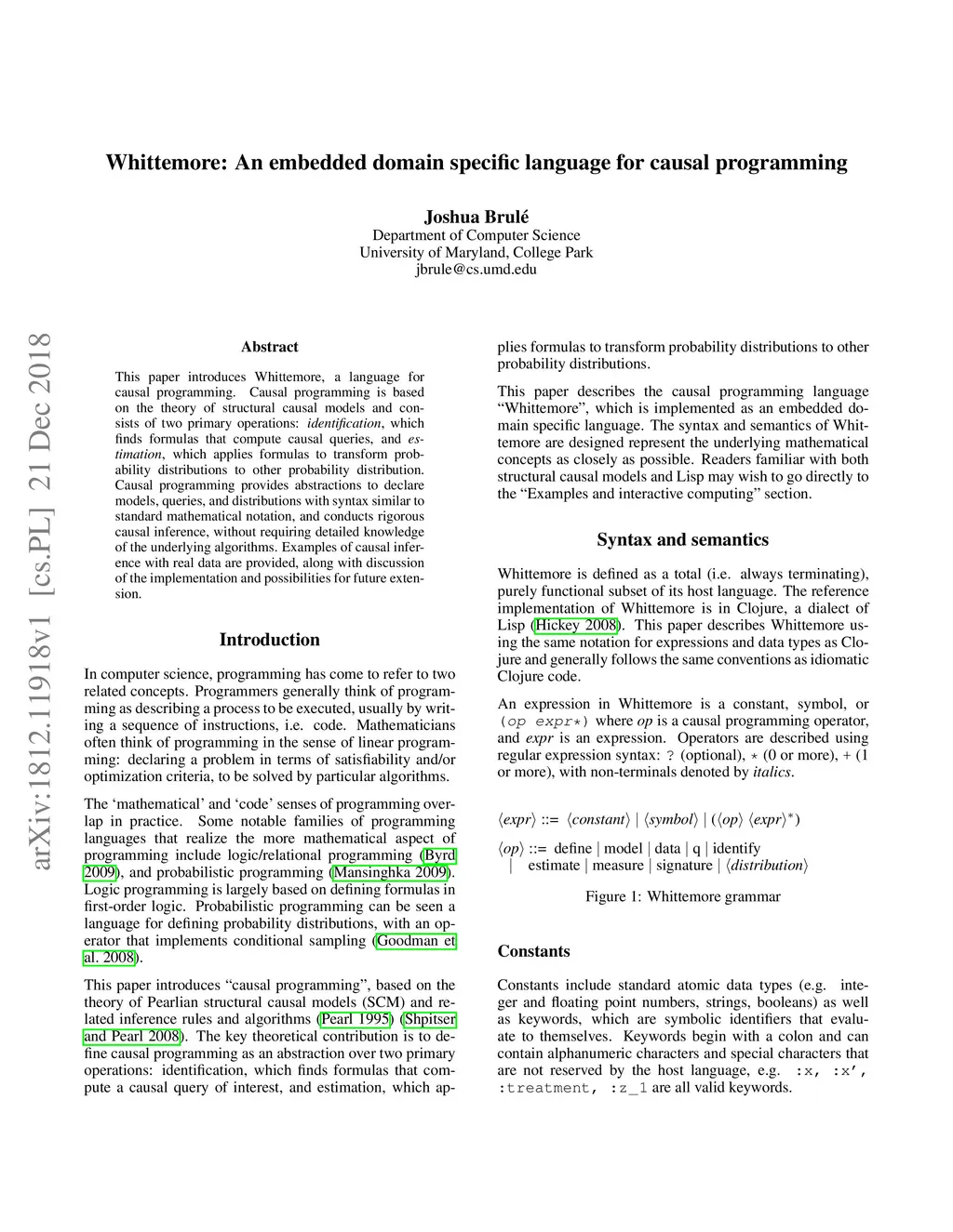 This paper introduces Whittemore, a language for causal programming. Causal programming is based on the theory of structural causal models and consists of two primary operations: identification, which finds formulas that compute causal queries, and estimation, which applies formulas to transform probability distributions to other probability distribution. Causal programming provides abstractions to declare models, queries, and distributions with syntax similar to standard mathematical notation, and conducts rigorous causal inference, without requiring detailed knowledge of the underlying algorithms. Examples of causal inference with real data are provided, along with discussion of the implementation and possibilities for future extension.