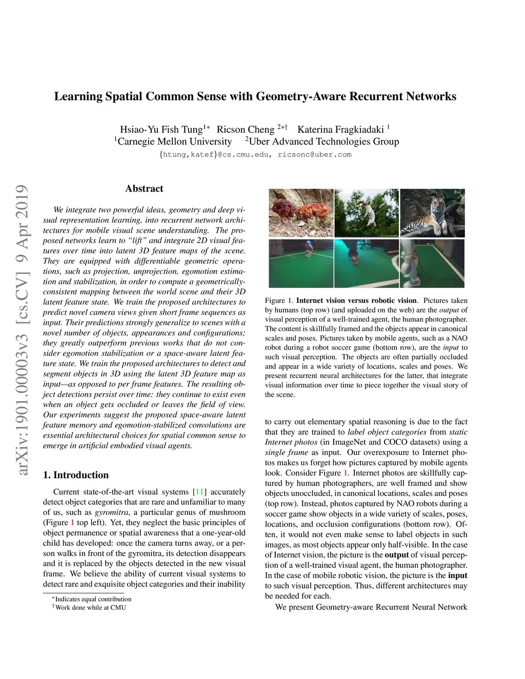 We integrate two powerful ideas, geometry and deep visual representation learning, into recurrent network architectures for mobile visual scene understanding. The proposed networks learn to "lift" and integrate 2D visual features over time into latent 3D feature maps of the scene. They are equipped with differentiable geometric operations, such as projection, unprojection, egomotion estimation and stabilization, in order to compute a geometrically-consistent mapping between the world scene and their 3D latent feature state. We train the proposed architectures to predict novel camera views given short frame sequences as input. Their predictions strongly generalize to scenes with a novel number of objects, appearances and configurations; they greatly outperform previous works that do not consider egomotion stabilization or a space-aware latent feature state. We train the proposed architectures to detect and segment objects in 3D using the latent 3D feature map as input--as opposed to per frame features. The resulting object detections persist over time: they continue to exist even when an object gets occluded or leaves the field of view. Our experiments suggest the proposed space-aware latent feature memory and egomotion-stabilized convolutions are essential architectural choices for spatial common sense to emerge in artificial embodied visual agents.