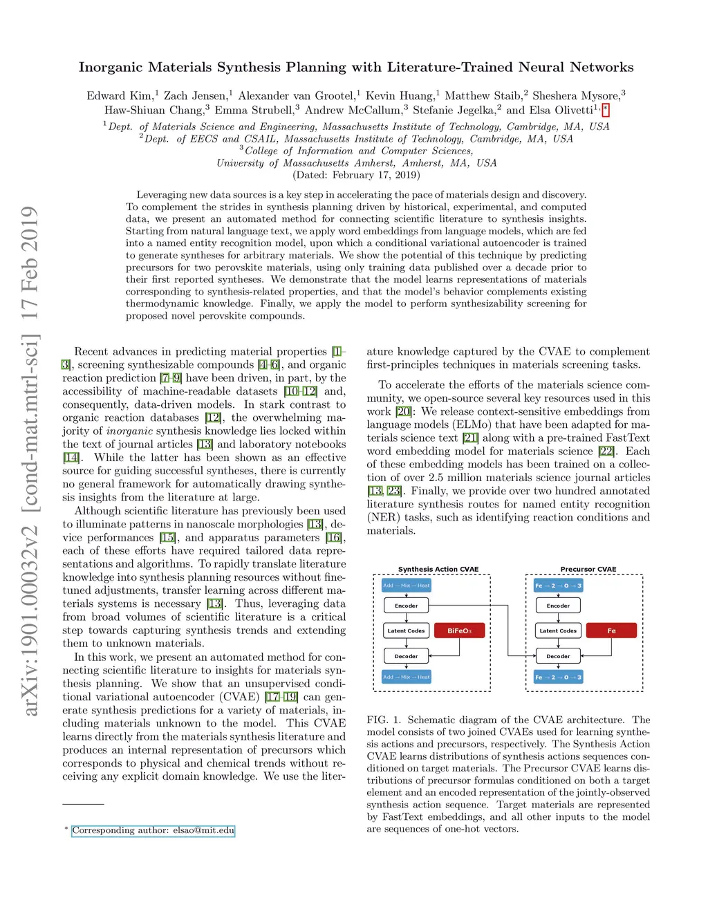 Leveraging new data sources is a key step in accelerating the pace of materials design and discovery. To complement the strides in synthesis planning driven by historical, experimental, and computed data, we present an automated method for connecting scientific literature to synthesis insights. Starting from natural language text, we apply word embeddings from language models, which are fed into a named entity recognition model, upon which a conditional variational autoencoder is trained to generate syntheses for arbitrary materials. We show the potential of this technique by predicting precursors for two perovskite materials, using only training data published over a decade prior to their first reported syntheses. We demonstrate that the model learns representations of materials corresponding to synthesis-related properties, and that the model's behavior complements existing thermodynamic knowledge. Finally, we apply the model to perform synthesizability screening for proposed novel perovskite compounds.