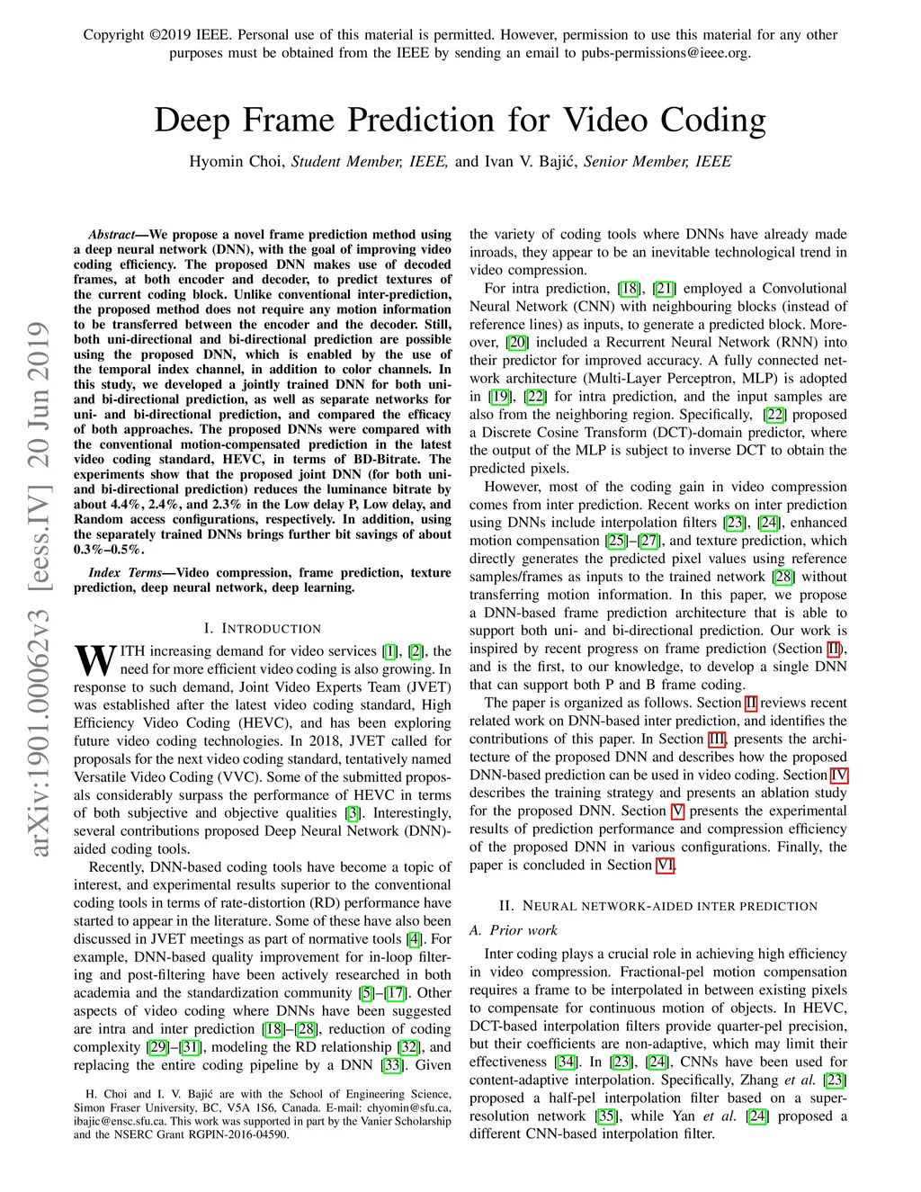 We propose a novel frame prediction method using a deep neural network (DNN), with the goal of improving video coding efficiency. The proposed DNN makes use of decoded frames, at both encoder and decoder, to predict textures of the current coding block. Unlike conventional inter-prediction, the proposed method does not require any motion information to be transferred between the encoder and the decoder. Still, both uni-directional and bi-directional prediction are possible using the proposed DNN, which is enabled by the use of the temporal index channel, in addition to color channels. In this study, we developed a jointly trained DNN for both uni- and bi- directional prediction, as well as separate networks for uni- and bi-directional prediction, and compared the efficacy of both approaches. The proposed DNNs were compared with the conventional motion-compensated prediction in the latest video coding standard, HEVC, in terms of BD-Bitrate. The experiments show that the proposed joint DNN (for both uni- and bi-directional prediction) reduces the luminance bitrate by about 4.4%, 2.4%, and 2.3% in the Low delay P, Low delay, and Random access configurations, respectively. In addition, using the separately trained DNNs brings further bit savings of about 0.3%-0.5%.