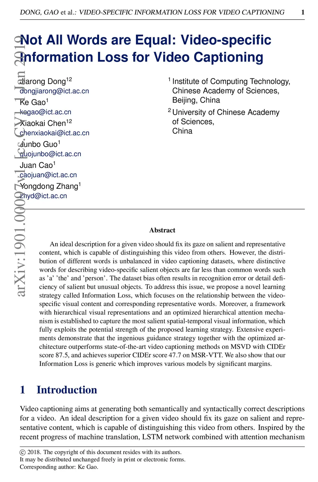 An ideal description for a given video should fix its gaze on salient and representative content, which is capable of distinguishing this video from others. However, the distribution of different words is unbalanced in video captioning datasets, where distinctive words for describing video-specific salient objects are far less than common words such as á' 'the' and 'person'. The dataset bias often results in recognition error or detail deficiency of salient but unusual objects. To address this issue, we propose a novel learning strategy called Information Loss, which focuses on the relationship between the video-specific visual content and corresponding representative words. Moreover, a framework with hierarchical visual representations and an optimized hierarchical attention mechanism is established to capture the most salient spatial-temporal visual information, which fully exploits the potential strength of the proposed learning strategy. Extensive experiments demonstrate that the ingenious guidance strategy together with the optimized architecture outperforms state-of-the-art video captioning methods on MSVD with CIDEr score 87.5, and achieves superior CIDEr score 47.7 on MSR-VTT. We also show that our Information Loss is generic which improves various models by significant margins.