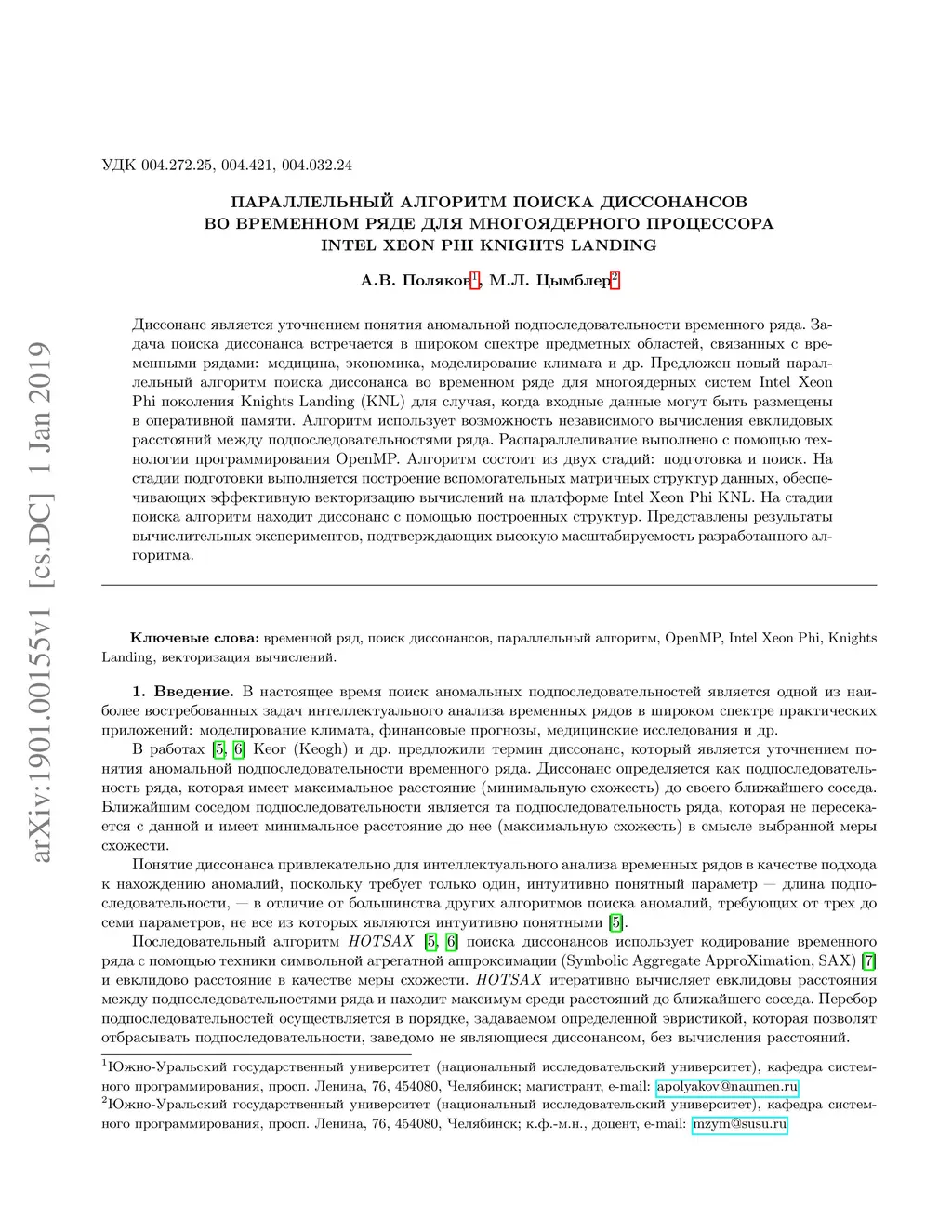 Discord is a refinement of the concept of anomalous subsequence of a time series. The task of discords discovery is applied in a wide range of subject domains related to time series: medicine, economics, climate modeling, etc. In this paper, we propose a novel parallel algorithm for discords discovery for the Intel Xeon Phi Knights Landing (KNL) many-core systems for the case when input data fit in main memory. The algorithm exploits the ability to independently calculate Euclidean distances between the subsequences of the time series. Computations are paralleled through OpenMP technology. The algorithm consists of two stages, namely precomputations and discovery. At the precomputations stage, we construct the auxiliary matrix data structures, which ensure efficient vectorization of computations on Intel Xeon Phi KNL. At the discovery stage, the algorithm finds discord based upon the structures above. Experimental evaluation confirms the high scalability of the developed algorithm.