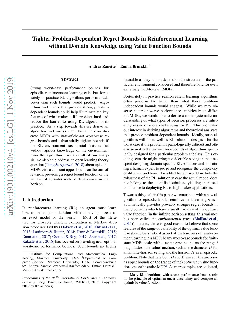 Strong worst-case performance bounds for episodic reinforcement learning exist but fortunately in practice RL algorithms perform much better than such bounds would predict. Algorithms and theory that provide strong problem-dependent bounds could help illuminate the key features of what makes a RL problem hard and reduce the barrier to using RL algorithms in practice. As a step towards this we derive an algorithm for finite horizon discrete MDPs and associated analysis that both yields state-of-the art worst-case regret bounds in the dominant terms and yields substantially tighter bounds if the RL environment has small environmental norm, which is a function of the variance of the next-state value functions. An important benefit of our algorithmic is that it does not require apriori knowledge of a bound on the environmental norm. As a result of our analysis, we also help address an open learning theory question~\cite{jiang2018open} about episodic MDPs with a constant upper-bound on the sum of rewards, providing a regret bound with no -dependence in the leading term that scales a polynomial function of the number of episodes.