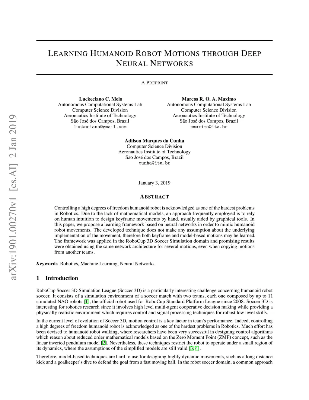 Learning Humanoid Robot Motions Through Deep Neural Networks