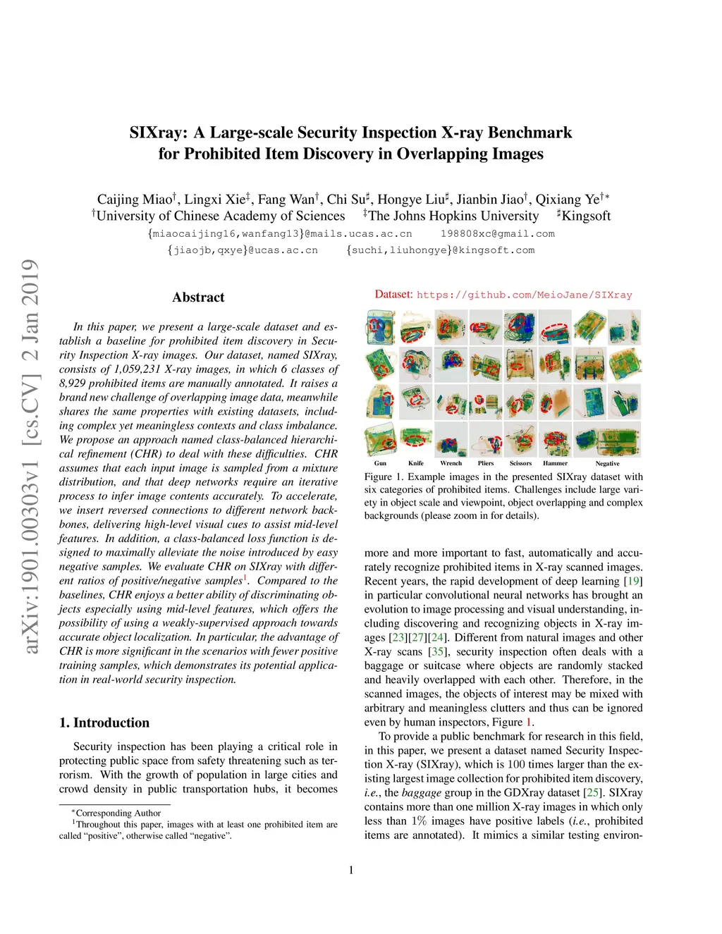 In this paper, we present a large-scale dataset and establish a baseline for prohibited item discovery in Security Inspection X-ray images. Our dataset, named SIXray, consists of 1,059,231 X-ray images, in which 6 classes of 8,929 prohibited items are manually annotated. It raises a brand new challenge of overlapping image data, meanwhile shares the same properties with existing datasets, including complex yet meaningless contexts and class imbalance. We propose an approach named class-balanced hierarchical refinement (CHR) to deal with these difficulties. CHR assumes that each input image is sampled from a mixture distribution, and that deep networks require an iterative process to infer image contents accurately. To accelerate, we insert reversed connections to different network backbones, delivering high-level visual cues to assist mid-level features. In addition, a class-balanced loss function is designed to maximally alleviate the noise introduced by easy negative samples. We evaluate CHR on SIXray with different ratios of positive/negative samples. Compared to the baselines, CHR enjoys a better ability of discriminating objects especially using mid-level features, which offers the possibility of using a weakly-supervised approach towards accurate object localization. In particular, the advantage of CHR is more significant in the scenarios with fewer positive training samples, which demonstrates its potential application in real-world security inspection.