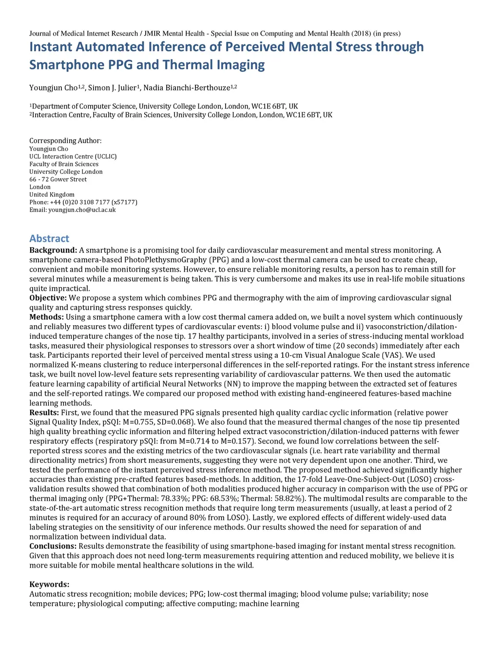 Background: A smartphone is a promising tool for daily cardiovascular measurement and mental stress monitoring. A smartphone camera-based PhotoPlethysmoGraphy (PPG) and a low-cost thermal camera can be used to create cheap, convenient and mobile monitoring systems. However, to ensure reliable monitoring results, a person has to remain still for several minutes while a measurement is being taken. This is very cumbersome and makes its use in real-life mobile situations quite impractical. Objective: We propose a system which combines PPG and thermography with the aim of improving cardiovascular signal quality and capturing stress responses quickly. Methods: Using a smartphone camera with a low cost thermal camera added on, we built a novel system which continuously and reliably measures two different types of cardiovascular events: i) blood volume pulse and ii) vasoconstriction/dilation-induced temperature changes of the nose tip. 17 healthy participants, involved in a series of stress-inducing mental workload tasks, measured their physiological responses to stressors over a short window of time (20 seconds) immediately after each task. Participants reported their level of perceived mental stress using a 10-cm Visual Analogue Scale (VAS). We used normalized K-means clustering to reduce interpersonal differences in the self-reported ratings. For the instant stress inference task, we built novel low-level feature sets representing variability of cardiovascular patterns. We then used the automatic feature learning capability of artificial Neural Networks (NN) to improve the mapping between the extracted set of features and the self-reported ratings. We compared our proposed method with existing hand-engineered features-based machine learning methods. Results, Conclusions: ... due to limited space here, we refer to our manuscript.