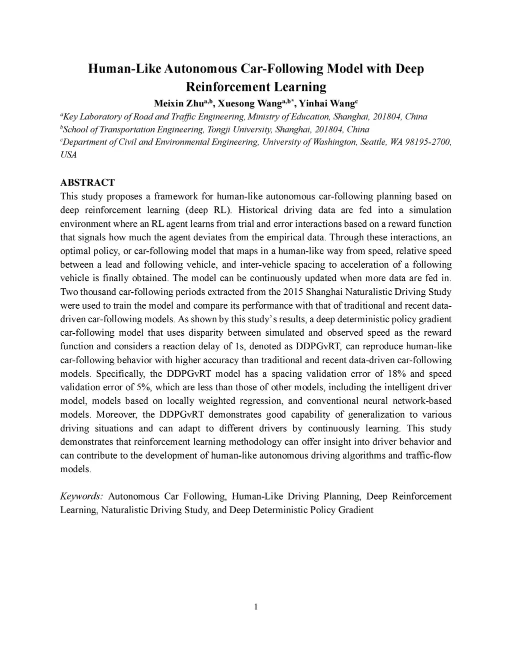 This study proposes a framework for human-like autonomous car-following planning based on deep reinforcement learning (deep RL). Historical driving data are fed into a simulation environment where an RL agent learns from trial and error interactions based on a reward function that signals how much the agent deviates from the empirical data. Through these interactions, an optimal policy, or car-following model that maps in a human-like way from speed, relative speed between a lead and following vehicle, and inter-vehicle spacing to acceleration of a following vehicle is finally obtained. The model can be continuously updated when more data are fed in. Two thousand car-following periods extracted from the 2015 Shanghai Naturalistic Driving Study were used to train the model and compare its performance with that of traditional and recent data-driven car-following models. As shown by this study results, a deep deterministic policy gradient car-following model that uses disparity between simulated and observed speed as the reward function and considers a reaction delay of 1s, denoted as DDPGvRT, can reproduce human-like car-following behavior with higher accuracy than traditional and recent data-driven car-following models. Specifically, the DDPGvRT model has a spacing validation error of 18% and speed validation error of 5%, which are less than those of other models, including the intelligent driver model, models based on locally weighted regression, and conventional neural network-based models. Moreover, the DDPGvRT demonstrates good capability of generalization to various driving situations and can adapt to different drivers by continuously learning. This study demonstrates that reinforcement learning methodology can offer insight into driver behavior and can contribute to the development of human-like autonomous driving algorithms and traffic-flow models.
