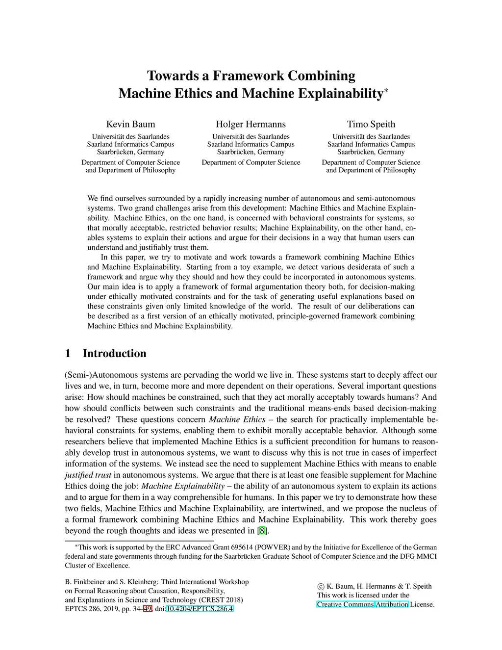 We find ourselves surrounded by a rapidly increasing number of autonomous and semi-autonomous systems. Two grand challenges arise from this development: Machine Ethics and Machine Explainability. Machine Ethics, on the one hand, is concerned with behavioral constraints for systems, so that morally acceptable, restricted behavior results; Machine Explainability, on the other hand, enables systems to explain their actions and argue for their decisions, so that human users can understand and justifiably trust them. In this paper, we try to motivate and work towards a framework combining Machine Ethics and Machine Explainability. Starting from a toy example, we detect various desiderata of such a framework and argue why they should and how they could be incorporated in autonomous systems. Our main idea is to apply a framework of formal argumentation theory both, for decision-making under ethical constraints and for the task of generating useful explanations given only limited knowledge of the world. The result of our deliberations can be described as a first version of an ethically motivated, principle-governed framework combining Machine Ethics and Machine Explainability