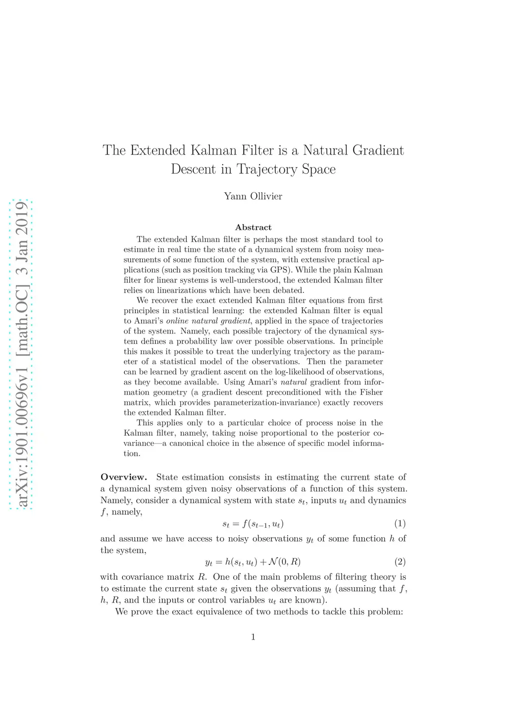 The extended Kalman filter is perhaps the most standard tool to estimate in real time the state of a dynamical system from noisy measurements of some function of the system, with extensive practical applications (such as position tracking via GPS). While the plain Kalman filter for linear systems is well-understood, the extended Kalman filter relies on linearizations which have been debated. We recover the exact extended Kalman filter equations from first principles in statistical learning: the extended Kalman filter is equal to Amari's online natural gradient, applied in the space of trajectories of the system. Namely, each possible trajectory of the dynamical system defines a probability law over possible observations. In principle this makes it possible to treat the underlying trajectory as the parameter of a statistical model of the observations. Then the parameter can be learned by gradient ascent on the log-likelihood of observations, as they become available. Using Amari's natural gradient from information geometry (a gradient descent preconditioned with the Fisher matrix, which provides parameterization-invariance) exactly recovers the extended Kalman filter. This applies only to a particular choice of process noise in the Kalman filter, namely, taking noise proportional to the posterior covariance - a canonical choice in the absence of specific model information.