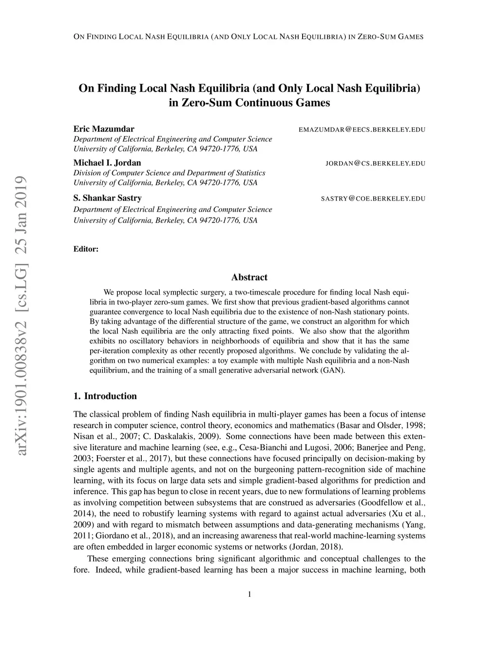 We propose local symplectic surgery, a two-timescale procedure for finding local Nash equilibria in two-player zero-sum games. We first show that previous gradient-based algorithms cannot guarantee convergence to local Nash equilibria due to the existence of non-Nash stationary points. By taking advantage of the differential structure of the game, we construct an algorithm for which the local Nash equilibria are the only attracting fixed points. We also show that the algorithm exhibits no oscillatory behaviors in neighborhoods of equilibria and show that it has the same per-iteration complexity as other recently proposed algorithms. We conclude by validating the algorithm on two numerical examples: a toy example with multiple Nash equilibria and a non-Nash equilibrium, and the training of a small generative adversarial network (GAN).