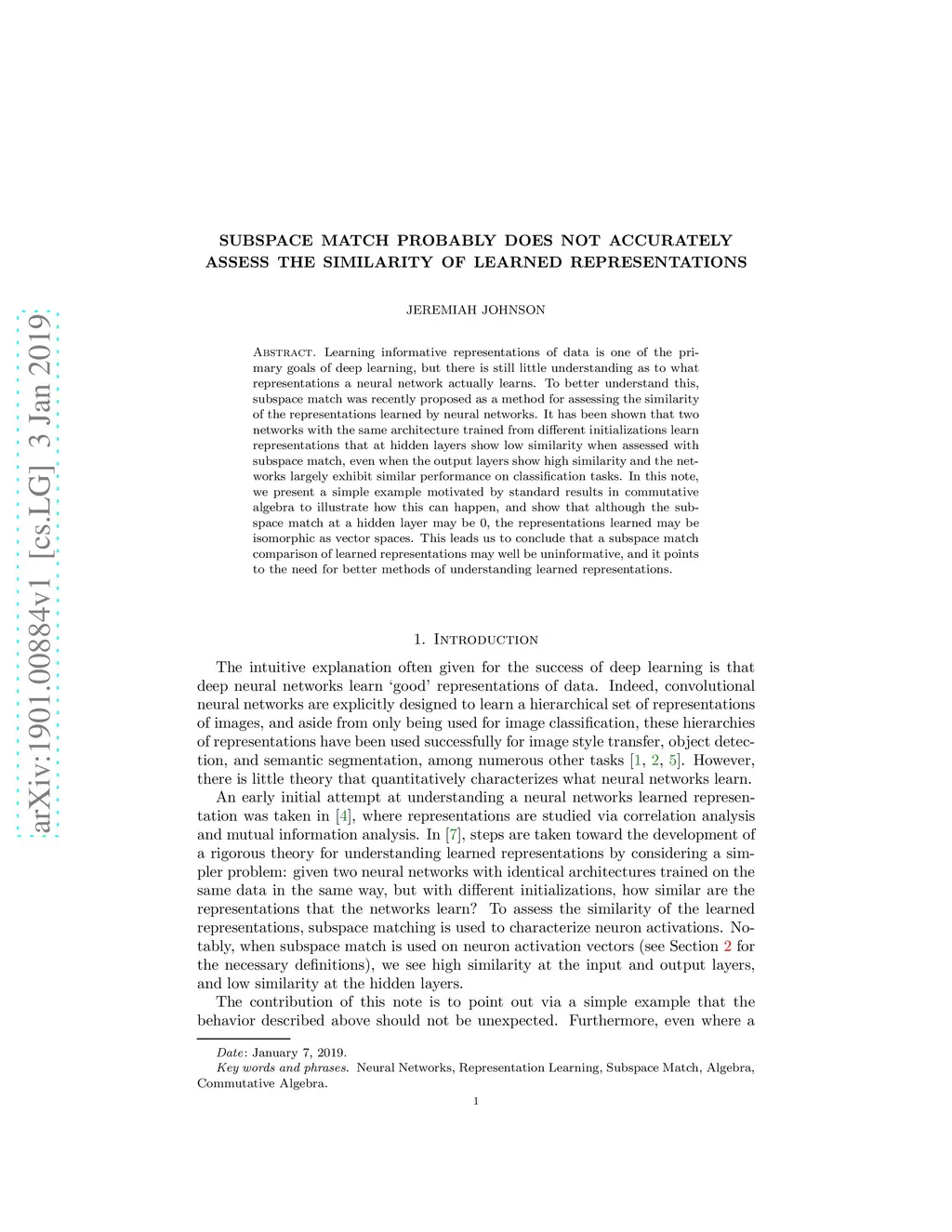 Learning informative representations of data is one of the primary goals of deep learning, but there is still little understanding as to what representations a neural network actually learns. To better understand this, subspace match was recently proposed as a method for assessing the similarity of the representations learned by neural networks. It has been shown that two networks with the same architecture trained from different initializations learn representations that at hidden layers show low similarity when assessed with subspace match, even when the output layers show high similarity and the networks largely exhibit similar performance on classification tasks. In this note, we present a simple example motivated by standard results in commutative algebra to illustrate how this can happen, and show that although the subspace match at a hidden layer may be 0, the representations learned may be isomorphic as vector spaces. This leads us to conclude that a subspace match comparison of learned representations may well be uninformative, and it points to the need for better methods of understanding learned representations.