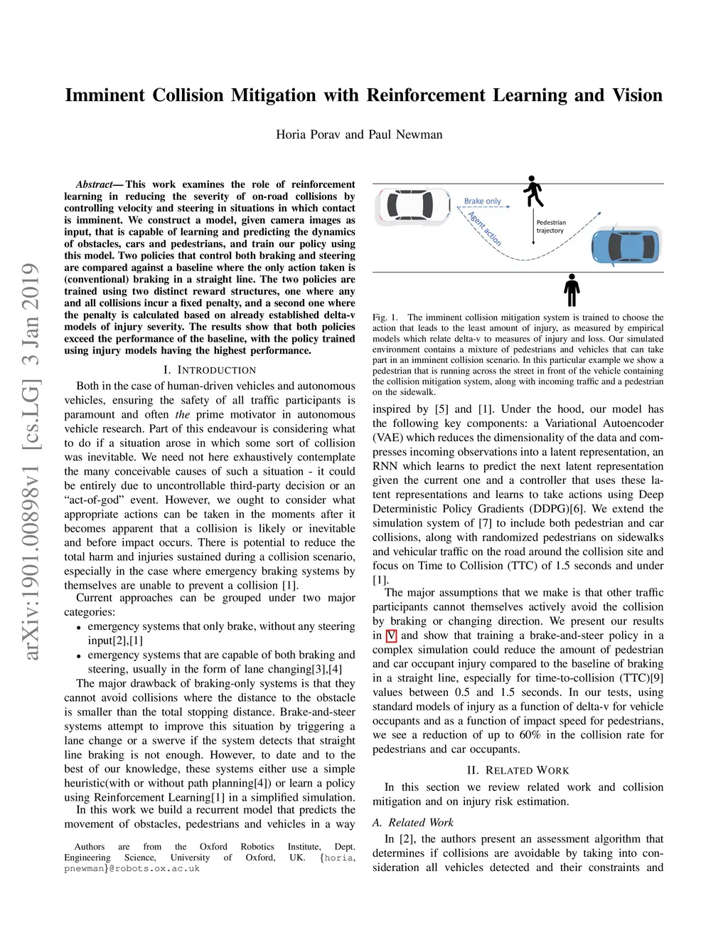 This work examines the role of reinforcement learning in reducing the severity of on-road collisions by controlling velocity and steering in situations in which contact is imminent. We construct a model, given camera images as input, that is capable of learning and predicting the dynamics of obstacles, cars and pedestrians, and train our policy using this model. Two policies that control both braking and steering are compared against a baseline where the only action taken is (conventional) braking in a straight line. The two policies are trained using two distinct reward structures, one where any and all collisions incur a fixed penalty, and a second one where the penalty is calculated based on already established delta-v models of injury severity. The results show that both policies exceed the performance of the baseline, with the policy trained using injury models having the highest performance.