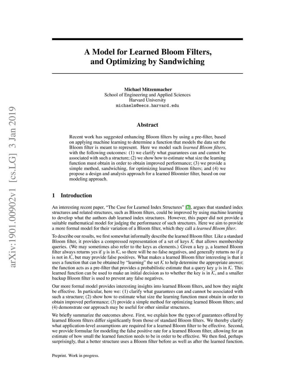 Recent work has suggested enhancing Bloom filters by using a pre-filter, based on applying machine learning to determine a function that models the data set the Bloom filter is meant to represent. Here we model such learned Bloom filters,, with the following outcomes: (1) we clarify what guarantees can and cannot be associated with such a structure; (2) we show how to estimate what size the learning function must obtain in order to obtain improved performance; (3) we provide a simple method, sandwiching, for optimizing learned Bloom filters; and (4) we propose a design and analysis approach for a learned Bloomier filter, based on our modeling approach.
