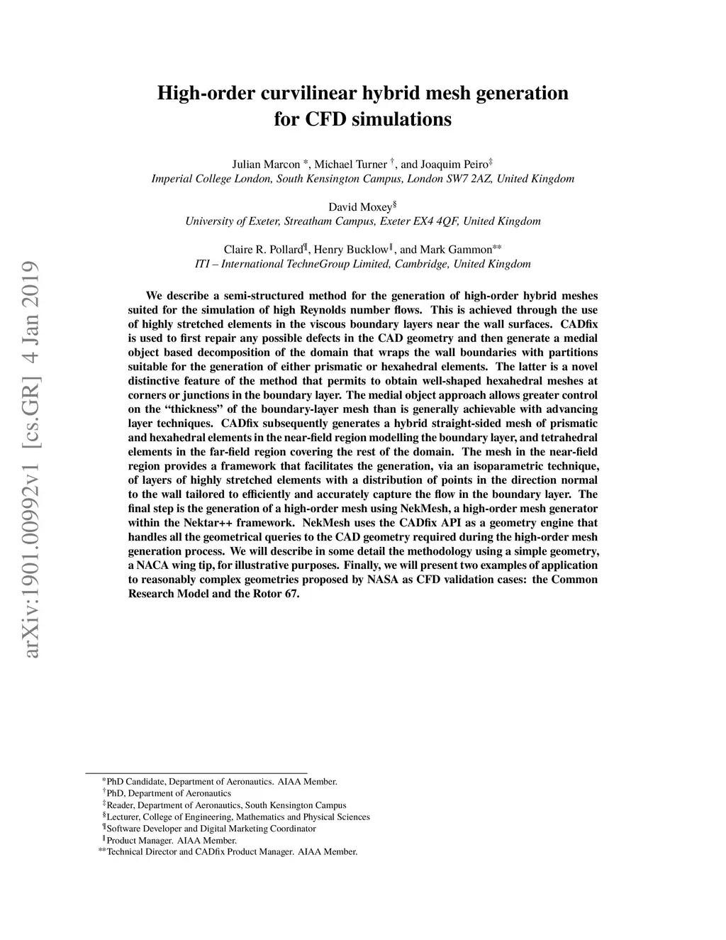 We describe a semi-structured method for the generation of high-order hybrid meshes suited for the simulation of high Reynolds number flows. This is achieved through the use of highly stretched elements in the viscous boundary layers near the wall surfaces. CADfix is used to first repair any possible defects in the CAD geometry and then generate a medial object based decomposition of the domain that wraps the wall boundaries with partitions suitable for the generation of either prismatic or hexahedral elements. The latter is a novel distinctive feature of the method that permits to obtain well-shaped hexahedral meshes at corners or junctions in the boundary layer. The medial object approach allows greater control on the "thickness" of the boundary-layer mesh than is generally achievable with advancing layer techniques. CADfix subsequently generates a hybrid straight sided mesh of prismatic and hexahedral elements in the near-field region modelling the boundary layer, and tetrahedral elements in the far-field region covering the rest of the domain. The mesh in the near-field region provides a framework that facilitates the generation, via an isoparametric technique, of layers of highly stretched elements with a distribution of points in the direction normal to the wall tailored to efficiently and accurately capture the flow in the boundary layer. The final step is the generation of a high-order mesh using NekMesh, a high-order mesh generator within the Nektar++ framework. NekMesh uses the CADfix API as a geometry engine that handles all the geometrical queries to the CAD geometry required during the high-order mesh generation process. We will describe in some detail the methodology using a simple geometry, a NACA wing tip, for illustrative purposes. Finally, we will present two examples of application to reasonably complex geometries proposed by NASA as CFD validation cases.