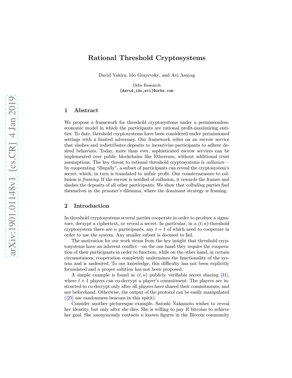 We propose a framework for threshold cryptosystems under a permissionless-economic model in which the participants are rational profit-maximizing entities. To date, threshold cryptosystems have been considered under permissioned settings with a limited adversary. Our framework relies on an escrow service that slashes and redistributes deposits to incentivize participants to adhere desired behaviors. Today, more than ever, sophisticated escrow services can be implemented over public blockchains like Ethereum, without additional trust assumptions. The key threat to rational threshold cryptosystems is collusion---by cooperating `illegally', a subset of participants can reveal the cryptosystem's secret, which, in turn is translated to unfair profit. Our countermeasure to collusion is framing. If the escrow is notified of collusion, it rewards the framer and slashes the deposits of all other participants. We show that colluding parties find themselves in the prisoner's dilemma, where the dominant strategy is framing.