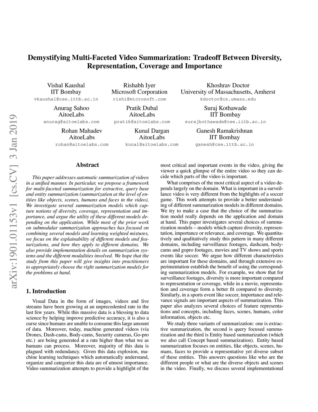 This paper addresses automatic summarization of videos in a unified manner. In particular, we propose a framework for multi-faceted summarization for extractive, query base and entity summarization (summarization at the level of entities like objects, scenes, humans and faces in the video). We investigate several summarization models which capture notions of diversity, coverage, representation and importance, and argue the utility of these different models depending on the application. While most of the prior work on submodular summarization approaches has focused oncombining several models and learning weighted mixtures, we focus on the explainability of different models and featurizations, and how they apply to different domains. We also provide implementation details on summarization systems and the different modalities involved. We hope that the study from this paper will give insights into practitioners to appropriately choose the right summarization models for the problems at hand.