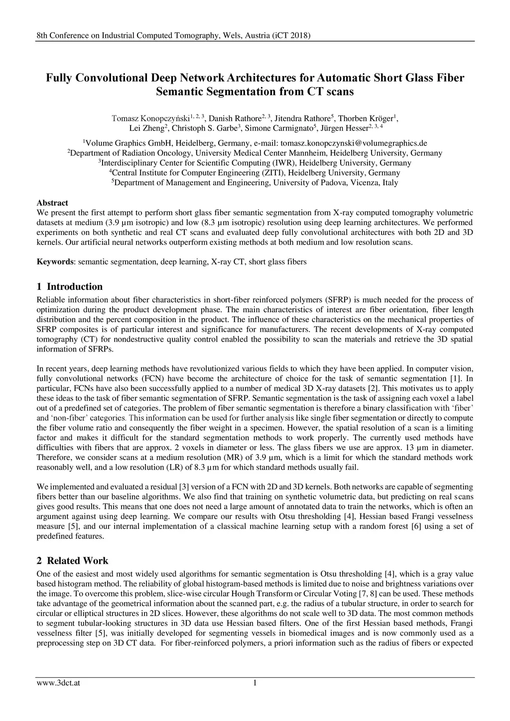 We present the first attempt to perform short glass fiber semantic segmentation from X-ray computed tomography volumetric datasets at medium (3.9 {\mu}m isotropic) and low (8.3 {\mu}m isotropic) resolution using deep learning architectures. We performed experiments on both synthetic and real CT scans and evaluated deep fully convolutional architectures with both 2D and 3D kernels. Our artificial neural networks outperform existing methods at both medium and low resolution scans.