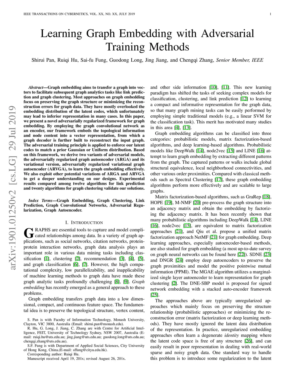 Graph embedding aims to transfer a graph into vectors to facilitate subsequent graph analytics tasks like link prediction and graph clustering. Most approaches on graph embedding focus on preserving the graph structure or minimizing the reconstruction errors for graph data. They have mostly overlooked the embedding distribution of the latent codes, which unfortunately may lead to inferior representation in many cases. In this paper, we present a novel adversarially regularized framework for graph embedding. By employing the graph convolutional network as an encoder, our framework embeds the topological information and node content into a vector representation, from which a graph decoder is further built to reconstruct the input graph. The adversarial training principle is applied to enforce our latent codes to match a prior Gaussian or Uniform distribution. Based on this framework, we derive two variants of adversarial models, the adversarially regularized graph autoencoder (ARGA) and its variational version, adversarially regularized variational graph autoencoder (ARVGA), to learn the graph embedding effectively. We also exploit other potential variations of ARGA and ARVGA to get a deeper understanding on our designs. Experimental results compared among twelve algorithms for link prediction and twenty algorithms for graph clustering validate our solutions.