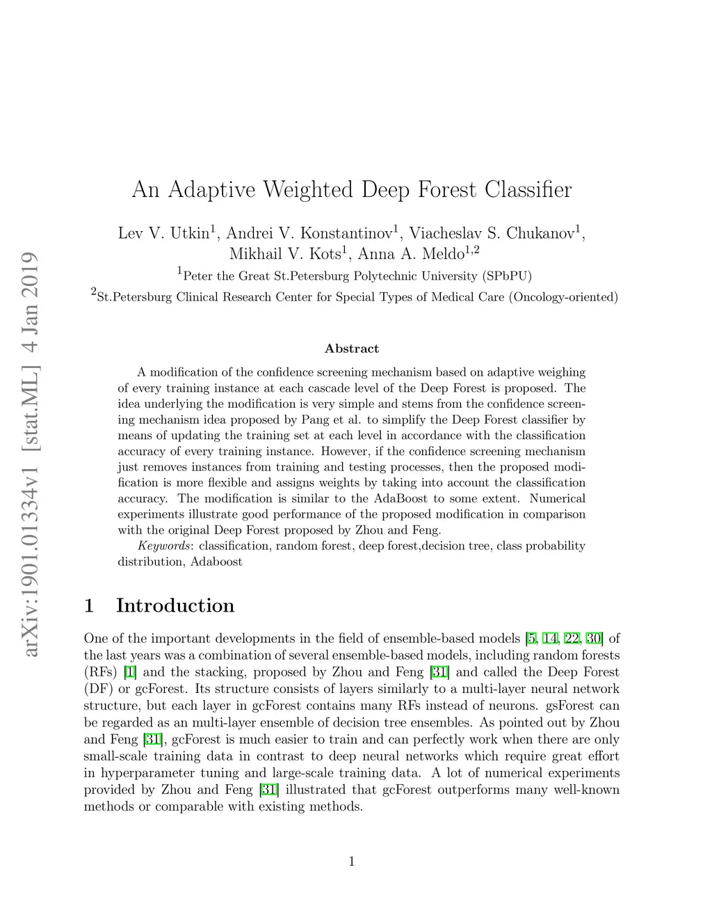 A modification of the confidence screening mechanism based on adaptive weighing of every training instance at each cascade level of the Deep Forest is proposed. The idea underlying the modification is very simple and stems from the confidence screening mechanism idea proposed by Pang et al. to simplify the Deep Forest classifier by means of updating the training set at each level in accordance with the classification accuracy of every training instance. However, if the confidence screening mechanism just removes instances from training and testing processes, then the proposed modification is more flexible and assigns weights by taking into account the classification accuracy. The modification is similar to the AdaBoost to some extent. Numerical experiments illustrate good performance of the proposed modification in comparison with the original Deep Forest proposed by Zhou and Feng.