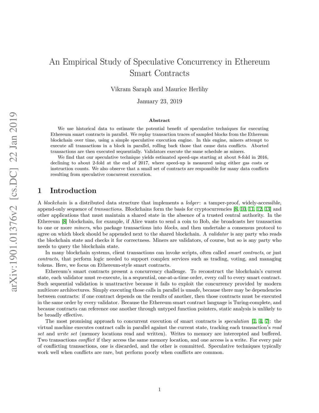 We use historical data to estimate the potential benefit of speculative techniques for executing Ethereum smart contracts in parallel. We replay transaction traces of sampled blocks from the Ethereum blockchain over time, using a simple speculative execution engine. In this engine, miners attempt to execute all transactions in a block in parallel, rolling back those that cause data conflicts. Aborted transactions are then executed sequentially. Validators execute the same schedule as miners. We find that our speculative technique yields estimated speed-ups starting at about 8-fold in 2016, declining to about 2-fold at the end of 2017, where speed-up is measured using either gas costs or instruction counts. We also observe that a small set of contracts are responsible for many data conflicts resulting from speculative concurrent execution.