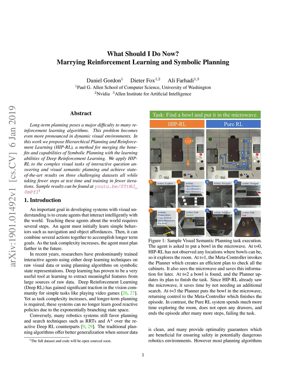 Long-term planning poses a major difficulty to many reinforcement learning algorithms. This problem becomes even more pronounced in dynamic visual environments. In this work we propose Hierarchical Planning and Reinforcement Learning (HIP-RL), a method for merging the benefits and capabilities of Symbolic Planning with the learning abilities of Deep Reinforcement Learning. We apply HIPRL to the complex visual tasks of interactive question answering and visual semantic planning and achieve state-of-the-art results on three challenging datasets all while taking fewer steps at test time and training in fewer iterations. Sample results can be found at youtu.be/0TtWJ_0mPfI