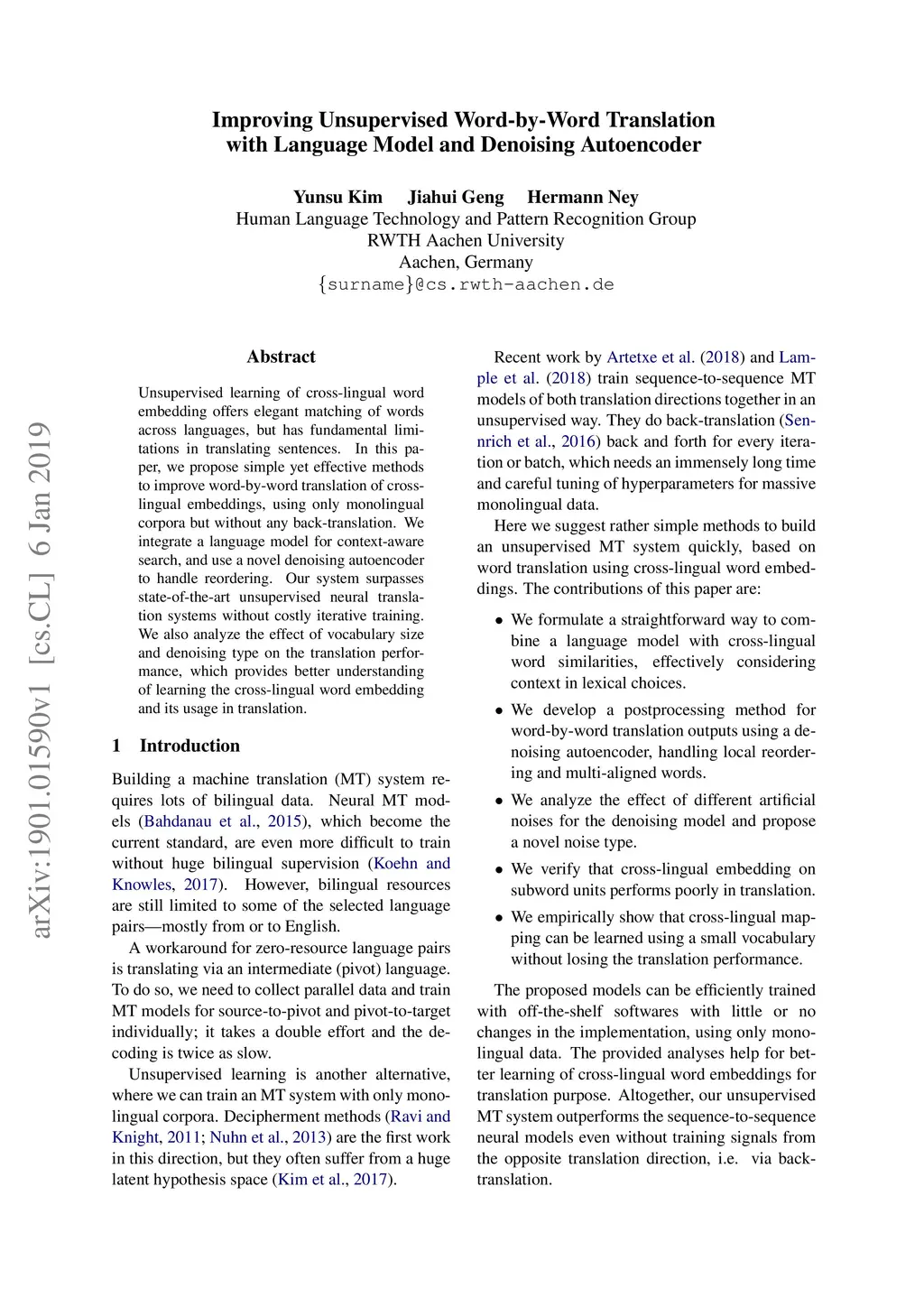 Unsupervised learning of cross-lingual word embedding offers elegant matching of words across languages, but has fundamental limitations in translating sentences. In this paper, we propose simple yet effective methods to improve word-by-word translation of cross-lingual embeddings, using only monolingual corpora but without any back-translation. We integrate a language model for context-aware search, and use a novel denoising autoencoder to handle reordering. Our system surpasses state-of-the-art unsupervised neural translation systems without costly iterative training. We also analyze the effect of vocabulary size and denoising type on the translation performance, which provides better understanding of learning the cross-lingual word embedding and its usage in translation.