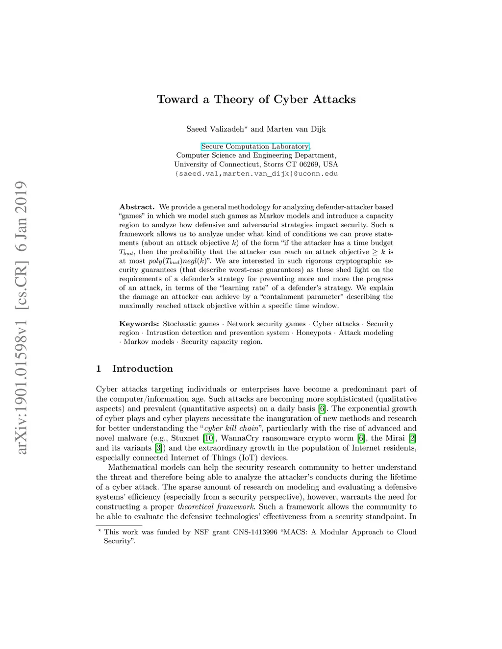 We provide a general methodology for analyzing defender-attacker based "games" in which we model such games as Markov models and introduce a capacity region to analyze how defensive and adversarial strategies impact security. Such a framework allows us to analyze under what kind of conditions we can prove statements (about an attack objective ) of the form "if the attacker has a time budget , then the probability that the attacker can reach an attack objective is at most ". We are interested in such rigorous cryptographic security guarantees (that describe worst-case guarantees) as these shed light on the requirements of a defender's strategy for preventing more and more the progress of an attack, in terms of the "learning rate" of a defender's strategy. We explain the damage an attacker can achieve by a "containment parameter" describing the maximally reached attack objective within a specific time window.