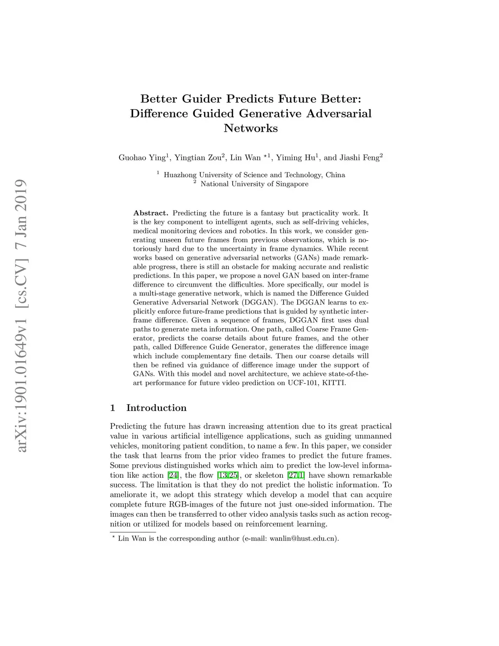 Predicting the future is a fantasy but practicality work. It is the key component to intelligent agents, such as self-driving vehicles, medical monitoring devices and robotics. In this work, we consider generating unseen future frames from previous obeservations, which is notoriously hard due to the uncertainty in frame dynamics. While recent works based on generative adversarial networks (GANs) made remarkable progress, there is still an obstacle for making accurate and realistic predictions. In this paper, we propose a novel GAN based on inter-frame difference to circumvent the difficulties. More specifically, our model is a multi-stage generative network, which is named the Difference Guided Generative Adversarial Netwok (DGGAN). The DGGAN learns to explicitly enforce future-frame predictions that is guided by synthetic inter-frame difference. Given a sequence of frames, DGGAN first uses dual paths to generate meta information. One path, called Coarse Frame Generator, predicts the coarse details about future frames, and the other path, called Difference Guide Generator, generates the difference image which include complementary fine details. Then our coarse details will then be refined via guidance of difference image under the support of GANs. With this model and novel architecture, we achieve state-of-the-art performance for future video prediction on UCF-101, KITTI.