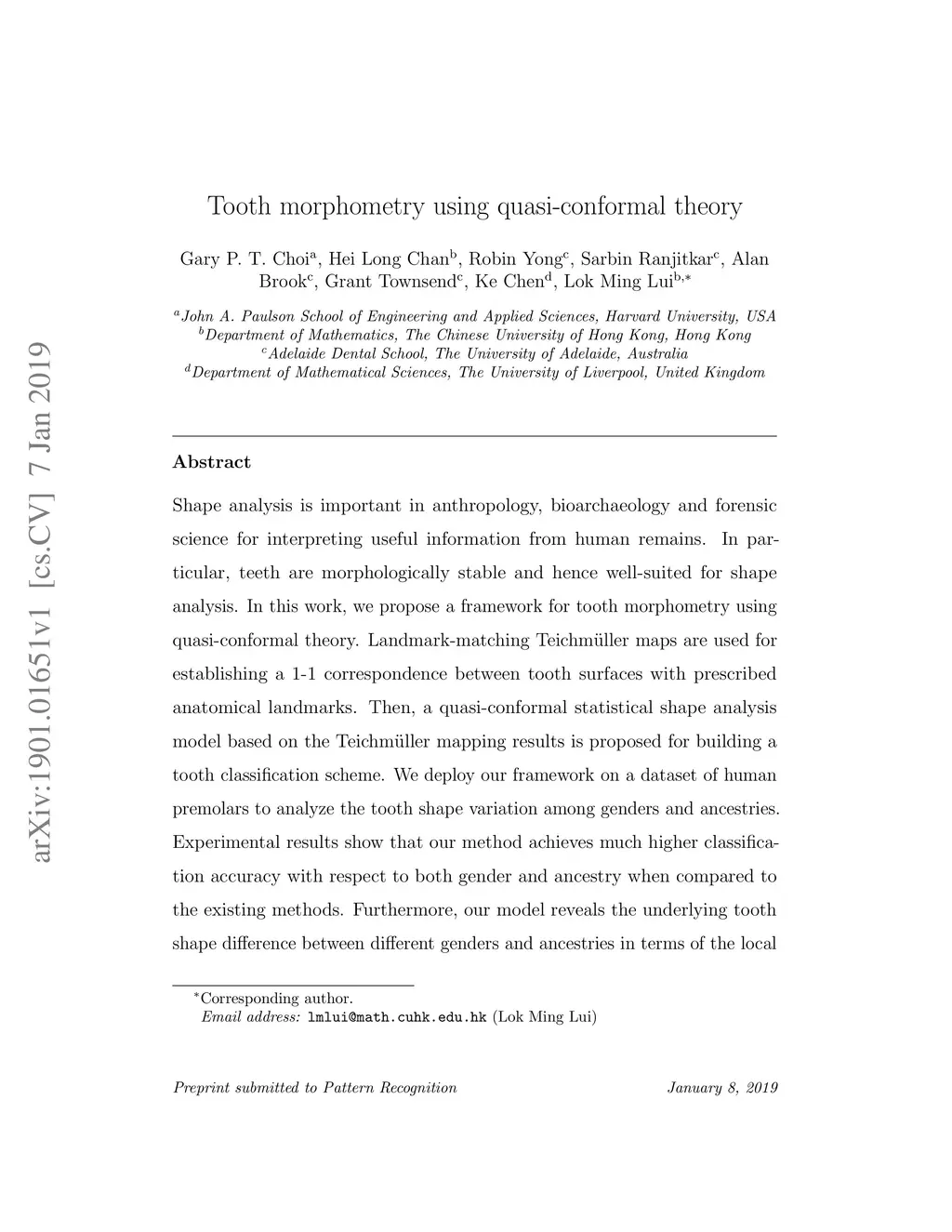 Shape analysis is important in anthropology, bioarchaeology and forensic science for interpreting useful information from human remains. In particular, teeth are morphologically stable and hence well-suited for shape analysis. In this work, we propose a framework for tooth morphometry using quasi-conformal theory. Landmark-matching Teichm\"uller maps are used for establishing a 1-1 correspondence between tooth surfaces with prescribed anatomical landmarks. Then, a quasi-conformal statistical shape analysis model based on the Teichm\"uller mapping results is proposed for building a tooth classification scheme. We deploy our framework on a dataset of human premolars to analyze the tooth shape variation among genders and ancestries. Experimental results show that our method achieves much higher classification accuracy with respect to both gender and ancestry when compared to the existing methods. Furthermore, our model reveals the underlying tooth shape difference between different genders and ancestries in terms of the local geometric distortion and curvatures.