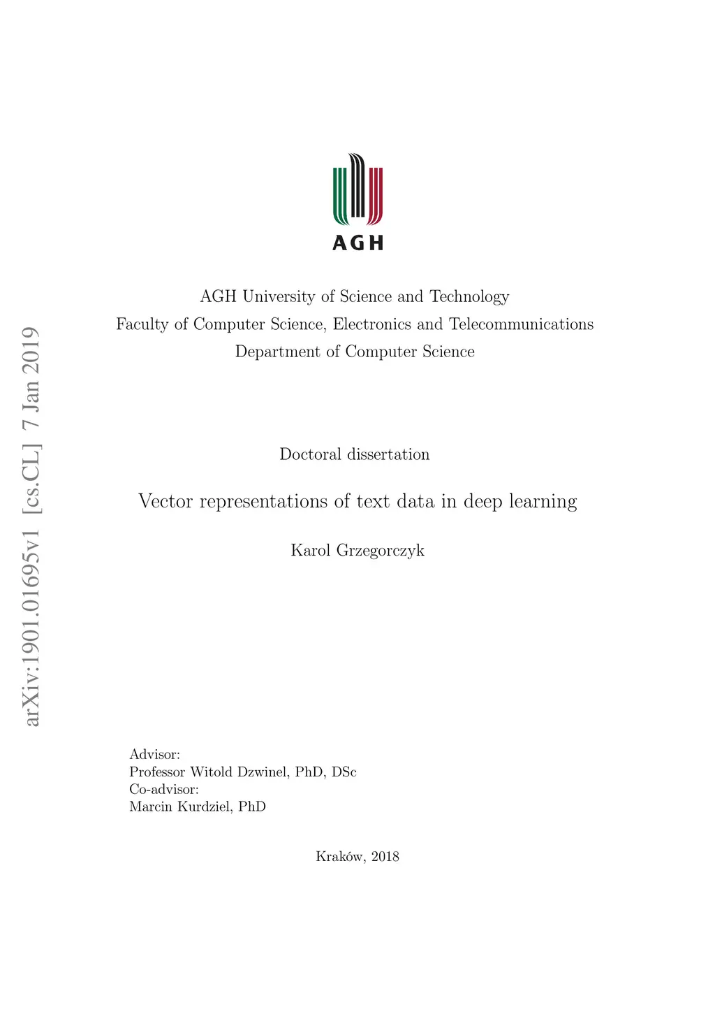 In this dissertation we report results of our research on dense distributed representations of text data. We propose two novel neural models for learning such representations. The first model learns representations at the document level, while the second model learns word-level representations. For document-level representations we propose Binary Paragraph Vector: a neural network models for learning binary representations of text documents, which can be used for fast document retrieval. We provide a thorough evaluation of these models and demonstrate that they outperform the seminal method in the field in the information retrieval task. We also report strong results in transfer learning settings, where our models are trained on a generic text corpus and then used to infer codes for documents from a domain-specific dataset. In contrast to previously proposed approaches, Binary Paragraph Vector models learn embeddings directly from raw text data. For word-level representations we propose Disambiguated Skip-gram: a neural network model for learning multi-sense word embeddings. Representations learned by this model can be used in downstream tasks, like part-of-speech tagging or identification of semantic relations. In the word sense induction task Disambiguated Skip-gram outperforms state-of-the-art models on three out of four benchmarks datasets. Our model has an elegant probabilistic interpretation. Furthermore, unlike previous models of this kind, it is differentiable with respect to all its parameters and can be trained with backpropagation. In addition to quantitative results, we present qualitative evaluation of Disambiguated Skip-gram, including two-dimensional visualisations of selected word-sense embeddings.