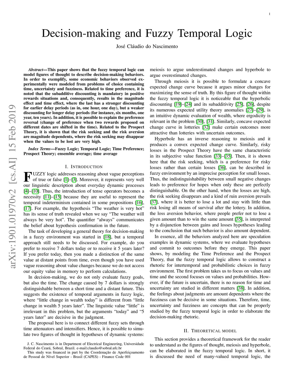 This paper shows that the fuzzy temporal logic can model figures of thought to describe decision-making behaviors. In order to exemplify, some economic behaviors observed experimentally were modeled from problems of choice containing time, uncertainty and fuzziness. Related to time preference, it is noted that the subadditive discounting is mandatory in positive rewards situations and, consequently, results in the magnitude effect and time effect, where the last has a stronger discounting for earlier delay periods (as in, one hour, one day), but a weaker discounting for longer delay periods (for instance, six months, one year, ten years). In addition, it is possible to explain the preference reversal (change of preference when two rewards proposed on different dates are shifted in the time). Related to the Prospect Theory, it is shown that the risk seeking and the risk aversion are magnitude dependents, where the risk seeking may disappear when the values to be lost are very high.