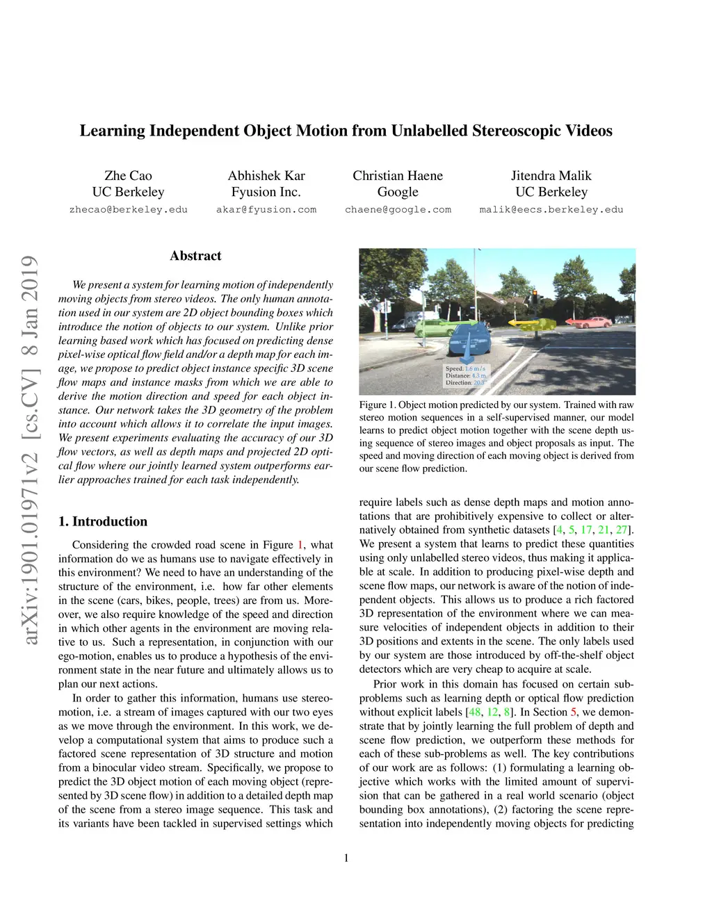 We present a system for learning motion of independently moving objects from stereo videos. The only human annotation used in our system are 2D object bounding boxes which introduce the notion of objects to our system. Unlike prior learning based work which has focused on predicting dense pixel-wise optical flow field and/or a depth map for each image, we propose to predict object instance specific 3D scene flow maps and instance masks from which we are able to derive the motion direction and speed for each object instance. Our network takes the 3D geometry of the problem into account which allows it to correlate the input images. We present experiments evaluating the accuracy of our 3D flow vectors, as well as depth maps and projected 2D optical flow where our jointly learned system outperforms earlier approaches trained for each task independently.
