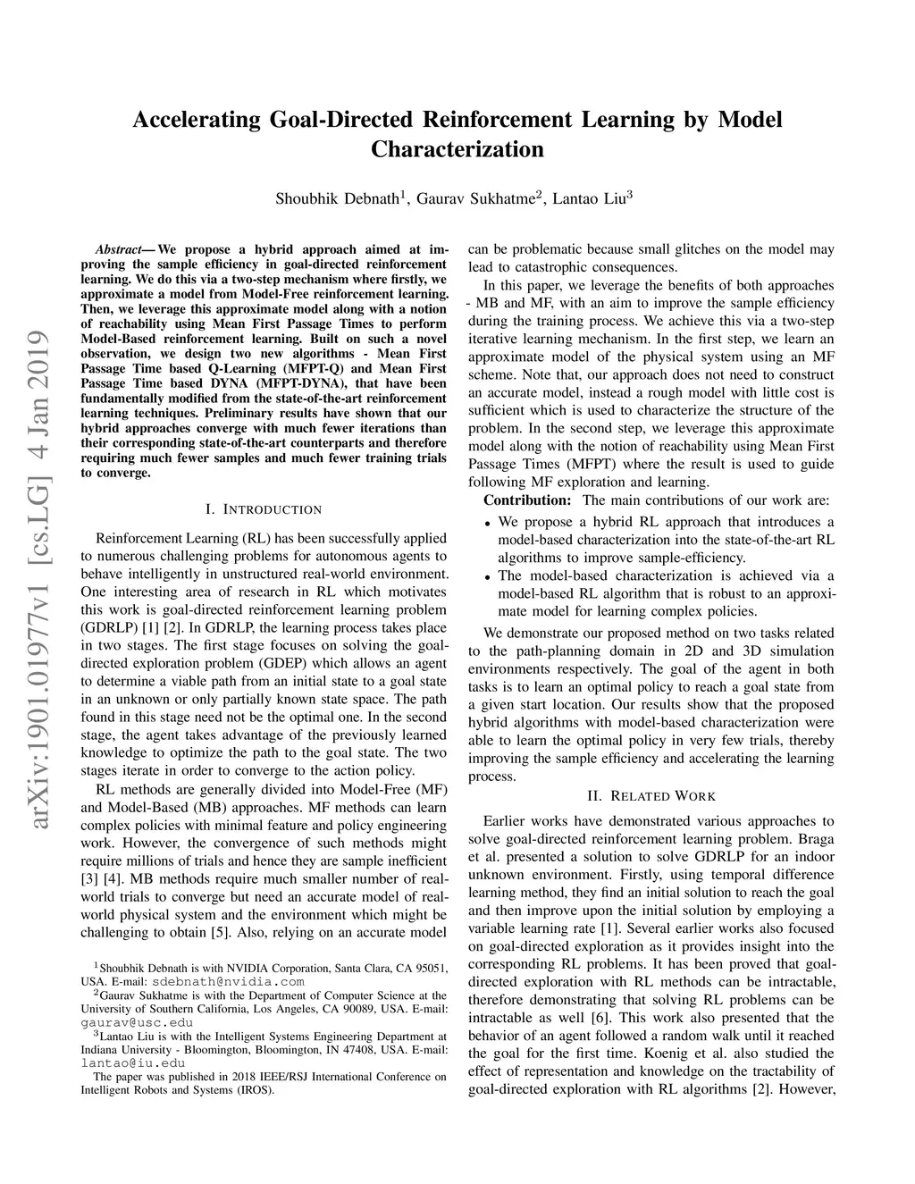 We propose a hybrid approach aimed at improving the sample efficiency in goal-directed reinforcement learning. We do this via a two-step mechanism where firstly, we approximate a model from Model-Free reinforcement learning. Then, we leverage this approximate model along with a notion of reachability using Mean First Passage Times to perform Model-Based reinforcement learning. Built on such a novel observation, we design two new algorithms - Mean First Passage Time based Q-Learning (MFPT-Q) and Mean First Passage Time based DYNA (MFPT-DYNA), that have been fundamentally modified from the state-of-the-art reinforcement learning techniques. Preliminary results have shown that our hybrid approaches converge with much fewer iterations than their corresponding state-of-the-art counterparts and therefore requiring much fewer samples and much fewer training trials to converge.