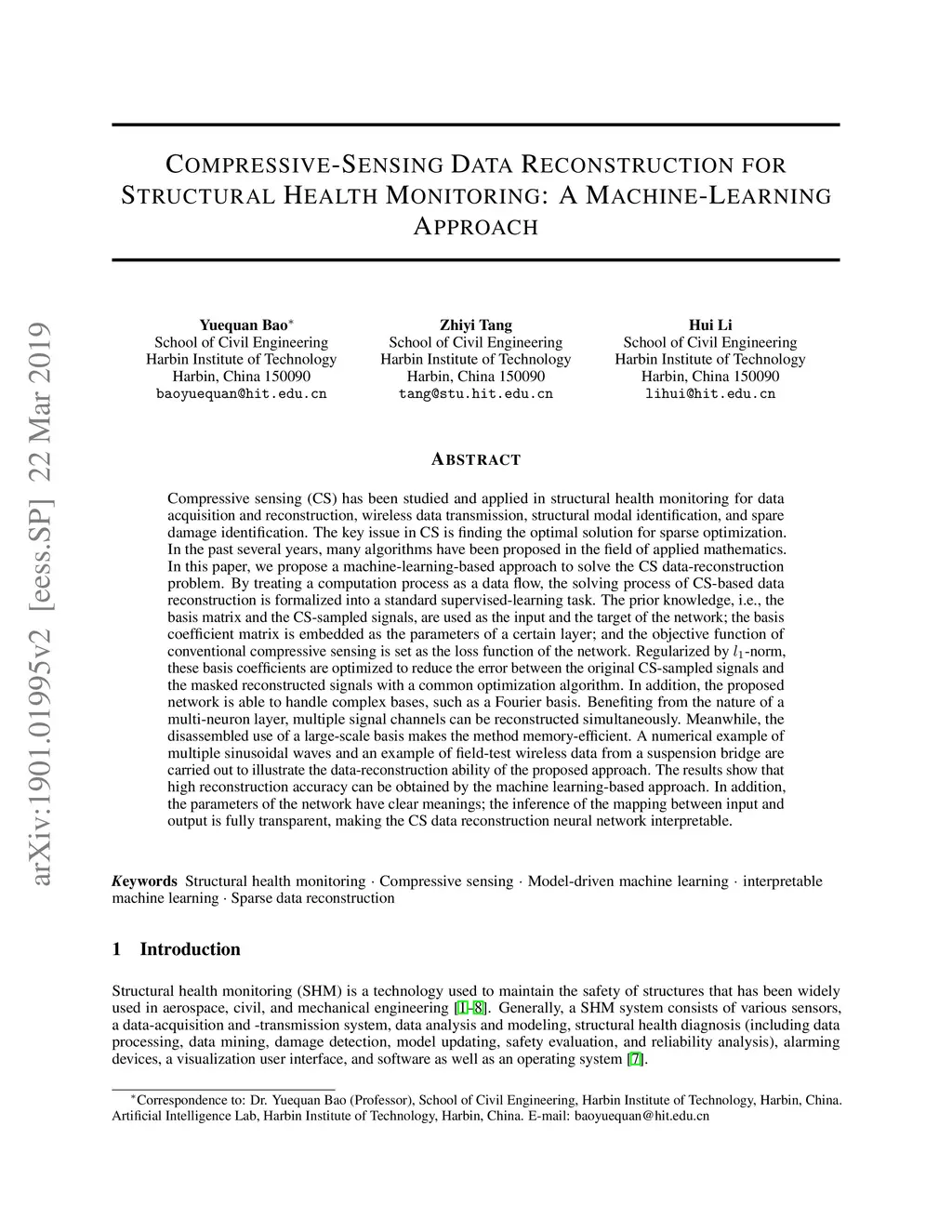 Compressive sensing (CS) has been studied and applied in structural health monitoring for wireless data acquisition and transmission, structural modal identification, and spare damage identification. The key issue in CS is finding the optimal solution for sparse optimization. In the past years, many algorithms have been proposed in the field of applied mathematics. In this paper, we propose a machine-learning-based approach to solve the CS data-reconstruction problem. By treating a computation process as a data flow, the process of CS-based data reconstruction is formalized into a standard supervised-learning task. The prior knowledge, i.e., the basis matrix and the CS-sampled signals, are used as the input and the target of the network; the basis coefficient matrix is embedded as the parameters of a certain layer; the objective function of conventional compressive sensing is set as the loss function of the network. Regularized by l1-norm, these basis coefficients are optimized to reduce the error between the original CS-sampled signals and the masked reconstructed signals with a common optimization algorithm. Also, the proposed network can handle complex bases, such as a Fourier basis. Benefiting from the nature of a multi-neuron layer, multiple signal channels can be reconstructed simultaneously. Meanwhile, the disassembled use of a large-scale basis makes the method memory-efficient. A numerical example of multiple sinusoidal waves and an example of field-test wireless data from a suspension bridge are carried out to illustrate the data-reconstruction ability of the proposed approach. The results show that high reconstruction accuracy can be obtained by the machine learning-based approach. Also, the parameters of the network have clear meanings; the inference of the mapping between input and output is fully transparent, making the CS data reconstruction neural network interpretable.