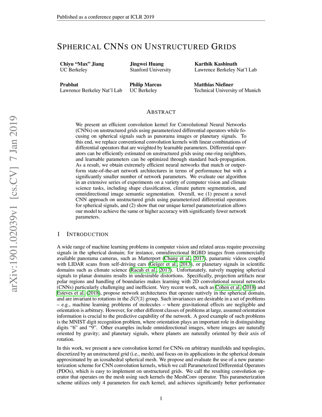 We present an efficient convolution kernel for Convolutional Neural Networks (CNNs) on unstructured grids using parameterized differential operators while focusing on spherical signals such as panorama images or planetary signals. To this end, we replace conventional convolution kernels with linear combinations of differential operators that are weighted by learnable parameters. Differential operators can be efficiently estimated on unstructured grids using one-ring neighbors, and learnable parameters can be optimized through standard back-propagation. As a result, we obtain extremely efficient neural networks that match or outperform state-of-the-art network architectures in terms of performance but with a significantly lower number of network parameters. We evaluate our algorithm in an extensive series of experiments on a variety of computer vision and climate science tasks, including shape classification, climate pattern segmentation, and omnidirectional image semantic segmentation. Overall, we present (1) a novel CNN approach on unstructured grids using parameterized differential operators for spherical signals, and (2) we show that our unique kernel parameterization allows our model to achieve the same or higher accuracy with significantly fewer network parameters.