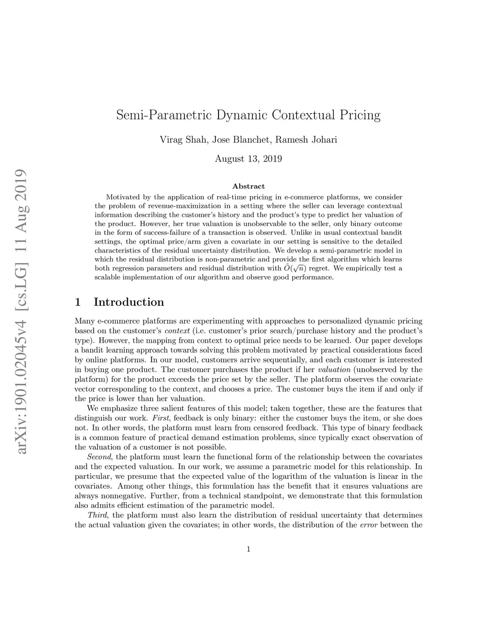 Motivated by the application of real-time pricing in e-commerce platforms, we consider the problem of revenue-maximization in a setting where the seller can leverage contextual information describing the customer's history and the product's type to predict her valuation of the product. However, her true valuation is unobservable to the seller, only binary outcome in the form of success-failure of a transaction is observed. Unlike in usual contextual bandit settings, the optimal price/arm given a covariate in our setting is sensitive to the detailed characteristics of the residual uncertainty distribution. We develop a semi-parametric model in which the residual distribution is non-parametric and provide the first algorithm which learns both regression parameters and residual distribution with regret. We empirically test a scalable implementation of our algorithm and observe good performance.