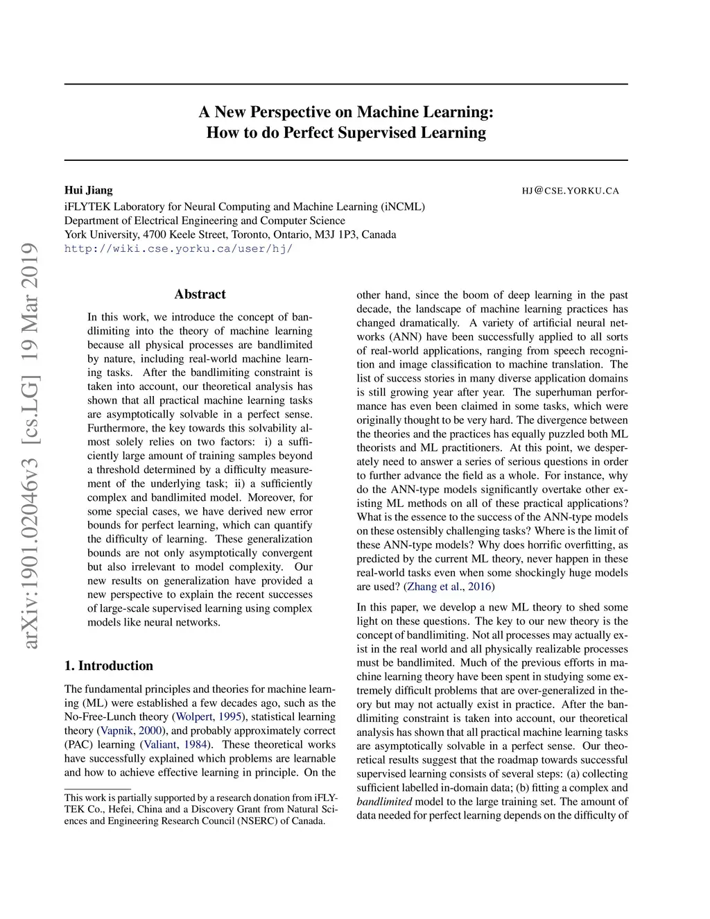 In this work, we introduce the concept of bandlimiting into the theory of machine learning because all physical processes are bandlimited by nature, including real-world machine learning tasks. After the bandlimiting constraint is taken into account, our theoretical analysis has shown that all practical machine learning tasks are asymptotically solvable in a perfect sense. Furthermore, the key towards this solvability almost solely relies on two factors: i) a sufficiently large amount of training samples beyond a threshold determined by a difficulty measurement of the underlying task; ii) a sufficiently complex and bandlimited model. Moreover, for some special cases, we have derived new error bounds for perfect learning, which can quantify the difficulty of learning. These generalization bounds are not only asymptotically convergent but also irrelevant to model complexity. Our new results on generalization have provided a new perspective to explain the recent successes of large-scale supervised learning using complex models like neural networks.