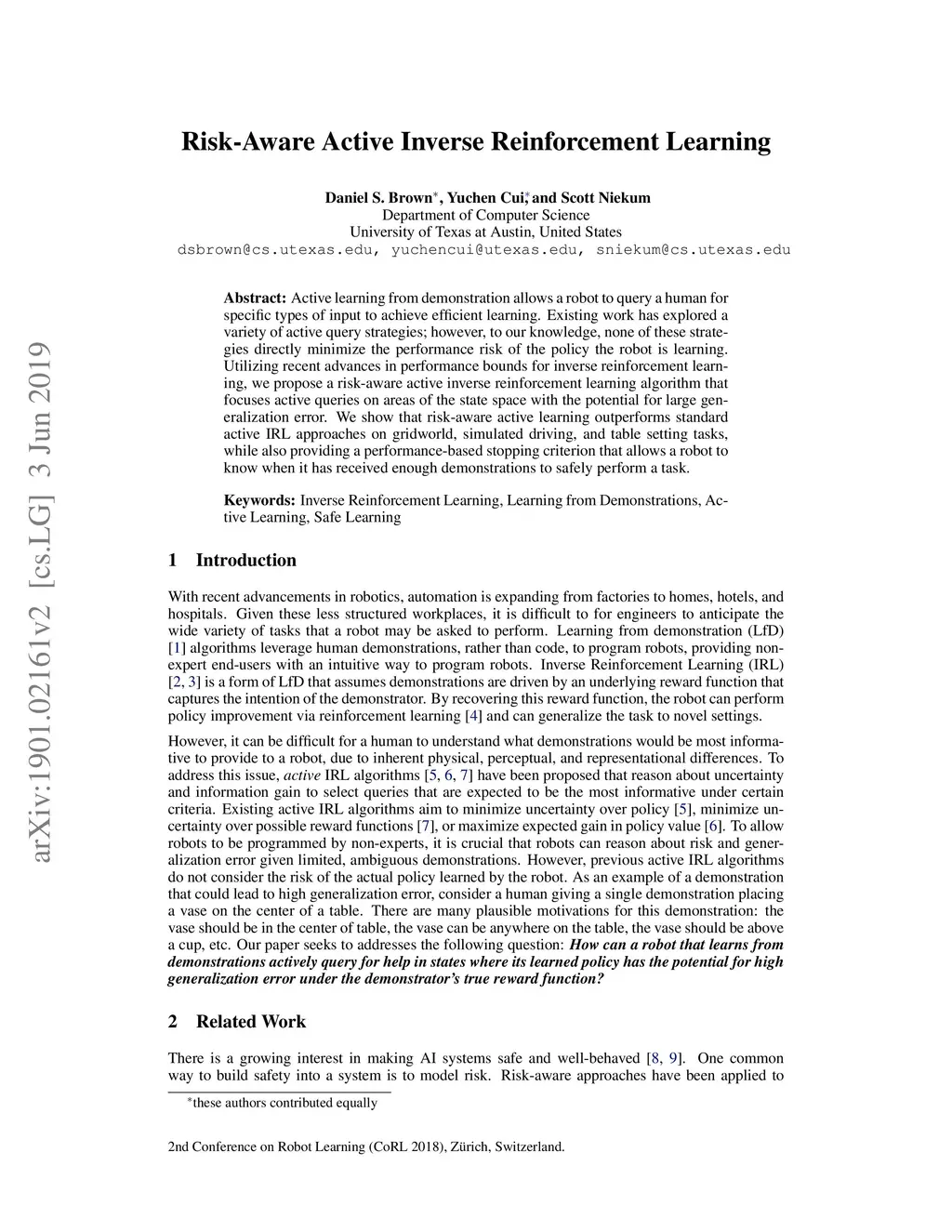 Active learning from demonstration allows a robot to query a human for specific types of input to achieve efficient learning. Existing work has explored a variety of active query strategies; however, to our knowledge, none of these strategies directly minimize the performance risk of the policy the robot is learning. Utilizing recent advances in performance bounds for inverse reinforcement learning, we propose a risk-aware active inverse reinforcement learning algorithm that focuses active queries on areas of the state space with the potential for large generalization error. We show that risk-aware active learning outperforms standard active IRL approaches on gridworld, simulated driving, and table setting tasks, while also providing a performance-based stopping criterion that allows a robot to know when it has received enough demonstrations to safely perform a task.