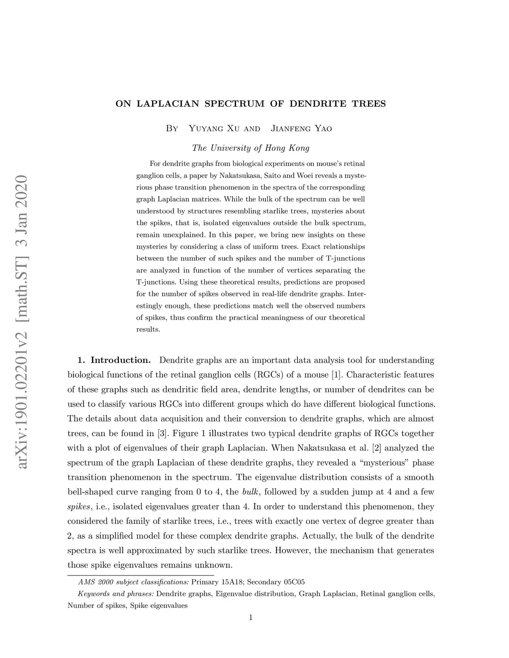 For dendrite graphs from biological experiments on mouse's retinal ganglion cells, a paper by Nakatsukasa, Saito and Woei reveals a mysterious phase transition phenomenon in the spectra of the corresponding graph Laplacian matrices. While the bulk of the spectrum can be well understood by structures resembling starlike trees, mysteries about the spikes, that is, isolated eigenvalues outside the bulk spectrum, remain unexplained. In this paper, we bring new insights on these mysteries by considering a class of uniform trees. Exact relationships between the number of such spikes and the number of T-junctions are analyzed in function of the number of vertices separating the T-junctions. Using these theoretic results, predictions are proposed for the number of spikes observed in real-life dendrite graphs. Interestingly enough, these predictions match well the observed numbers of spikes, thus confirm the practical meaningness of our theoretical results.