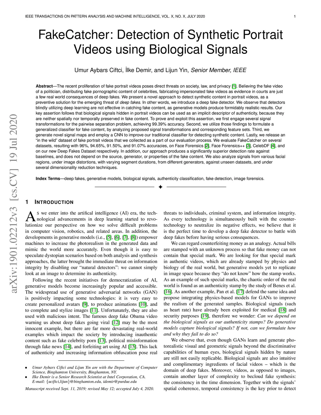 FakeCatcher: Detection of Synthetic Portrait Videos using Biological