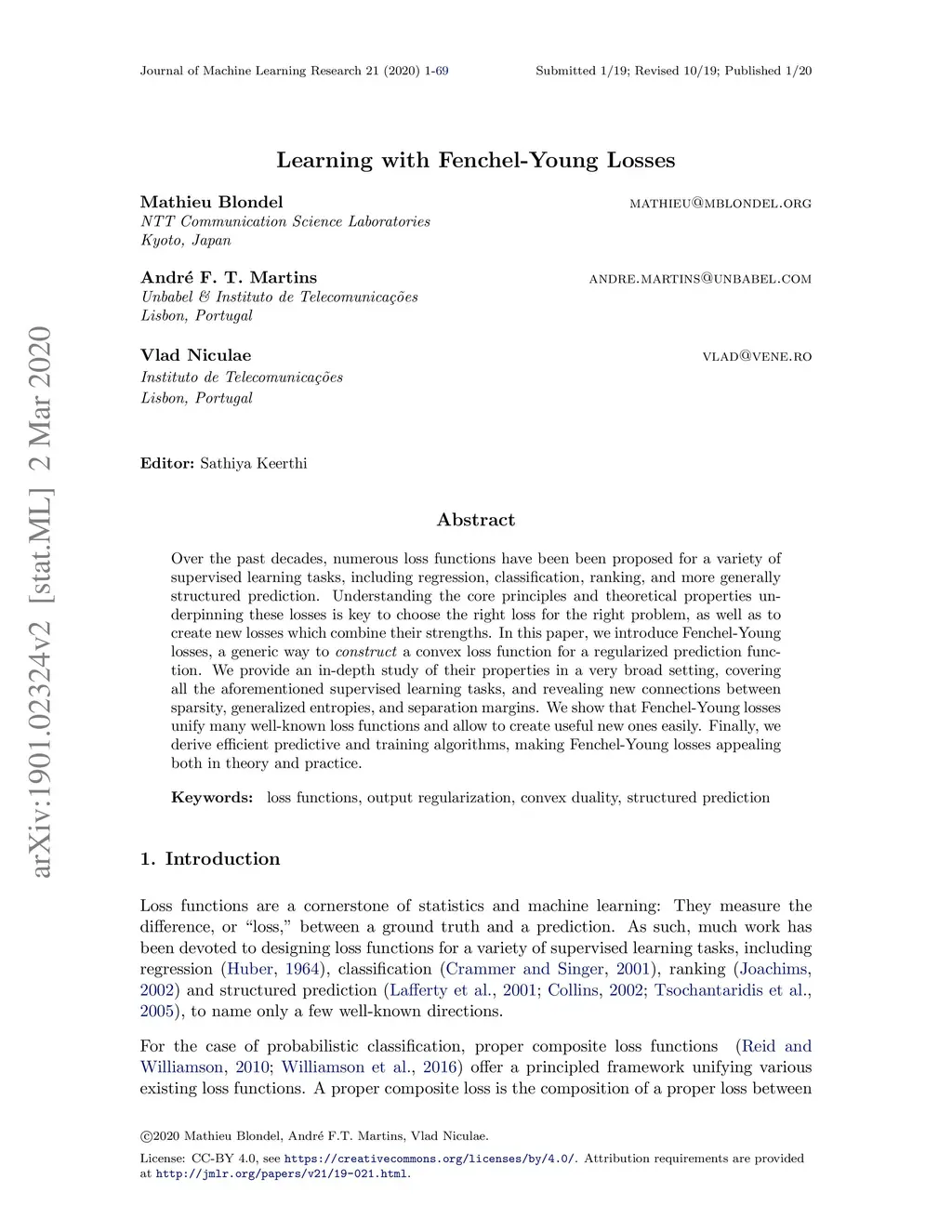 Over the past decades, numerous loss functions have been been proposed for a variety of supervised learning tasks, including regression, classification, ranking, and more generally structured prediction. Understanding the core principles and theoretical properties underpinning these losses is key to choose the right loss for the right problem, as well as to create new losses which combine their strengths. In this paper, we introduce Fenchel-Young losses, a generic way to construct a convex loss function for a regularized prediction function. We provide an in-depth study of their properties in a very broad setting, covering all the aforementioned supervised learning tasks, and revealing new connections between sparsity, generalized entropies, and separation margins. We show that Fenchel-Young losses unify many well-known loss functions and allow to create useful new ones easily. Finally, we derive efficient predictive and training algorithms, making Fenchel-Young losses appealing both in theory and practice.