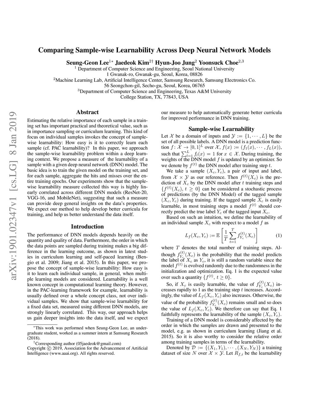Estimating the relative importance of each sample in a training set has important practical and theoretical value, such as in importance sampling or curriculum learning. This kind of focus on individual samples invokes the concept of sample-wise learnability: How easy is it to correctly learn each sample (cf. PAC learnability)? In this paper, we approach the sample-wise learnability problem within a deep learning context. We propose a measure of the learnability of a sample with a given deep neural network (DNN) model. The basic idea is to train the given model on the training set, and for each sample, aggregate the hits and misses over the entire training epochs. Our experiments show that the sample-wise learnability measure collected this way is highly linearly correlated across different DNN models (ResNet-20, VGG-16, and MobileNet), suggesting that such a measure can provide deep general insights on the data's properties. We expect our method to help develop better curricula for training, and help us better understand the data itself.